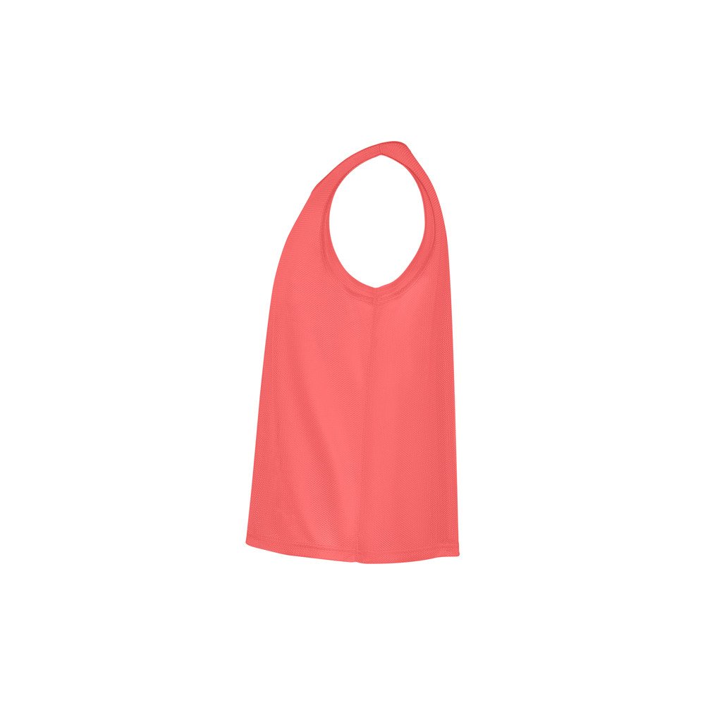„Unisex“ orui laidūs sportiniai marškinėliai be rankovių. Rankų angos ir apykaklė apsiūta tuo pačiu audiniu. Dvigubas apsiuvimas ant kraštelio.