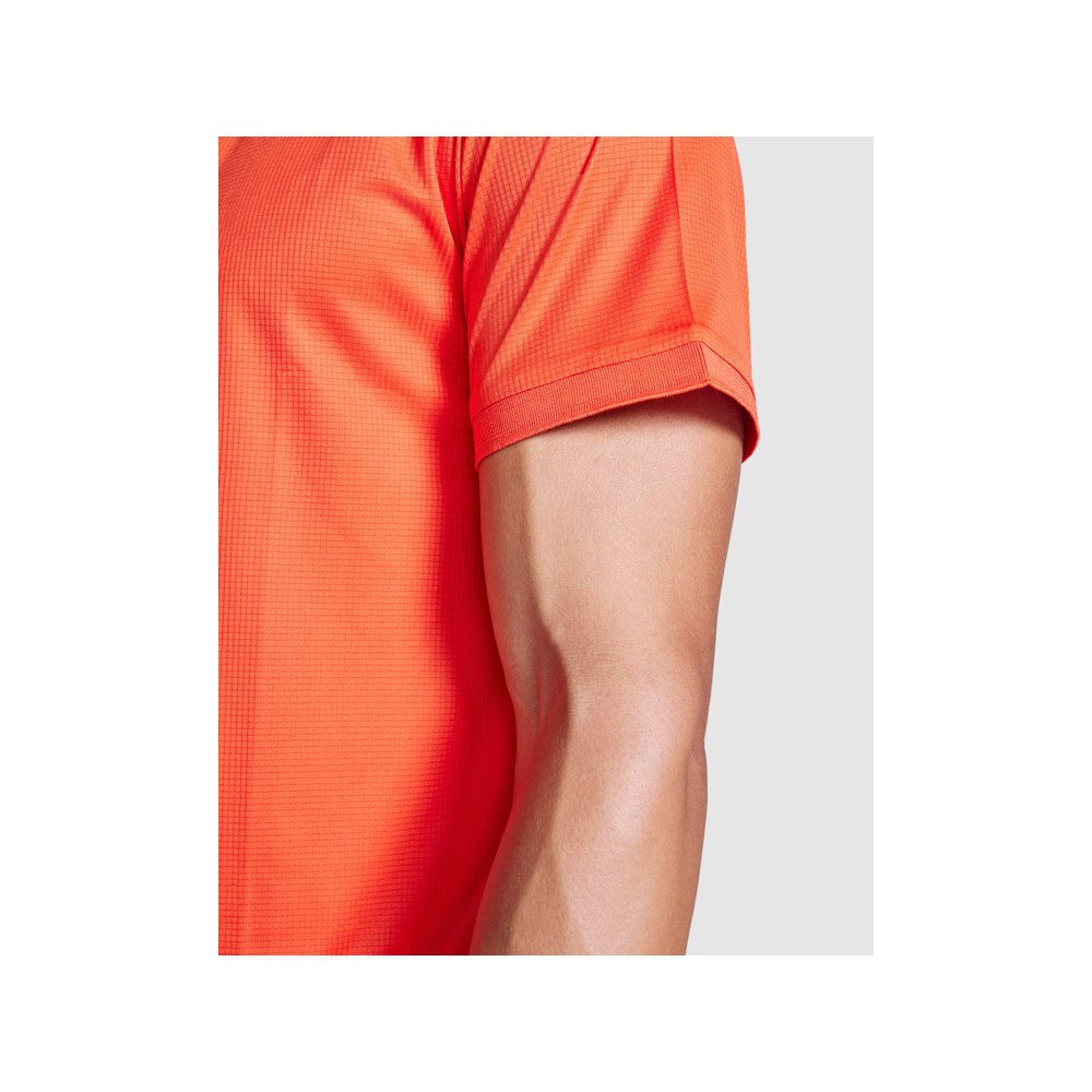 Sportiniai polo marškinėliai su trumpomis rankovėmis. 1x1 stulpelio poliesterio apykaklė su plastikiniais užsegimais, kurie dera prie atvartų. Derančios siūles paslepiančios juostelės. Rankovė su derančia 1x1 stulpelio apdaila.