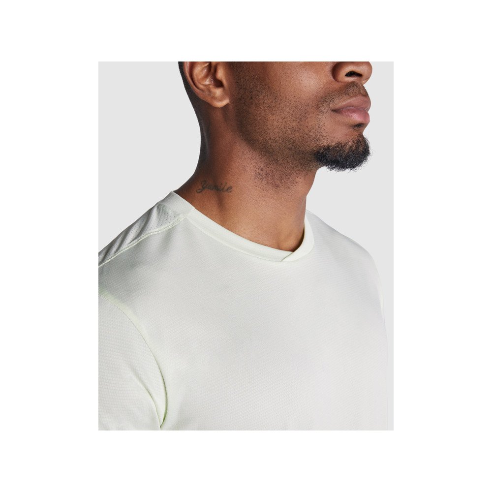 Vyriški sportiniai marškinėliai su trumpomis rankovėmis. Lengvas audinys, pagamintas iš perdirbto poliesterio. Apykaklė su sukryžiuotomis detalėmis ir paslėpto dygsnio tipo siūlėmis. Nugarinė kaklo dalis ir rankovės iš orui laidžios medžiagos. Priekinės ir pasvirusios siūlės šonuose ir ant pečių. Derinamas su orui laidžiais ir tampriais audiniais.