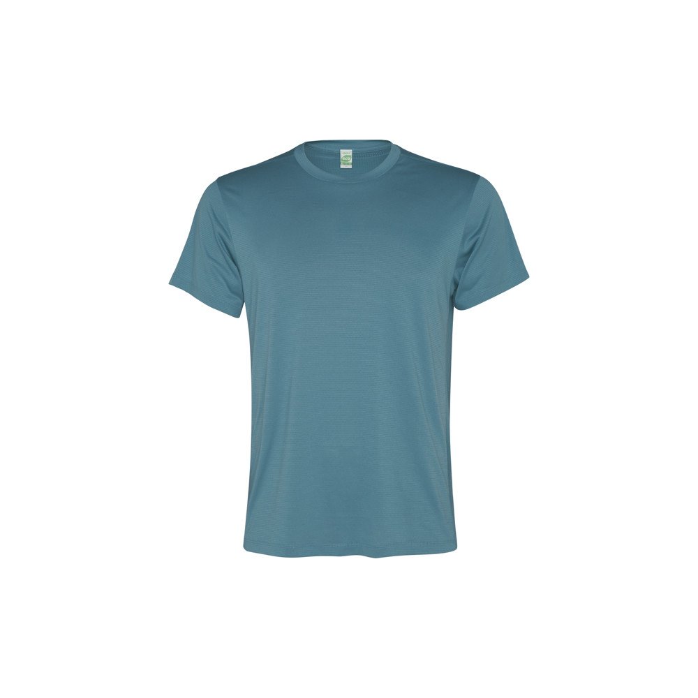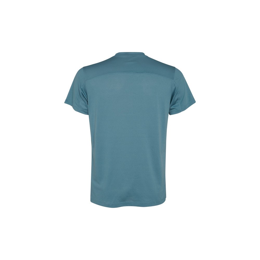 Vyriški sportiniai marškinėliai su trumpomis rankovėmis. Lengvas audinys, pagamintas iš perdirbto poliesterio. Apykaklė su sukryžiuotomis detalėmis ir paslėpto dygsnio tipo siūlėmis. Nugarinė kaklo dalis ir rankovės iš orui laidžios medžiagos. Priekinės ir pasvirusios siūlės šonuose ir ant pečių. Derinamas su orui laidžiais ir tampriais audiniais.