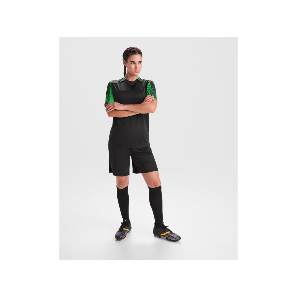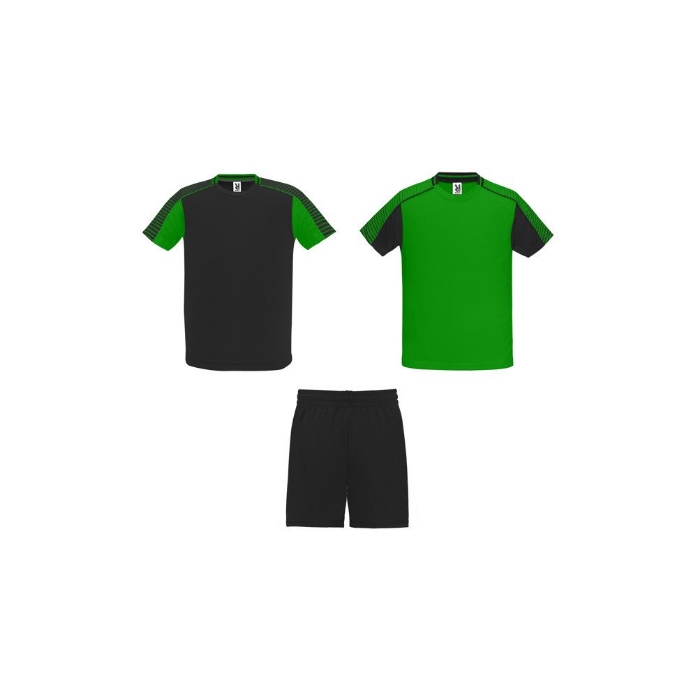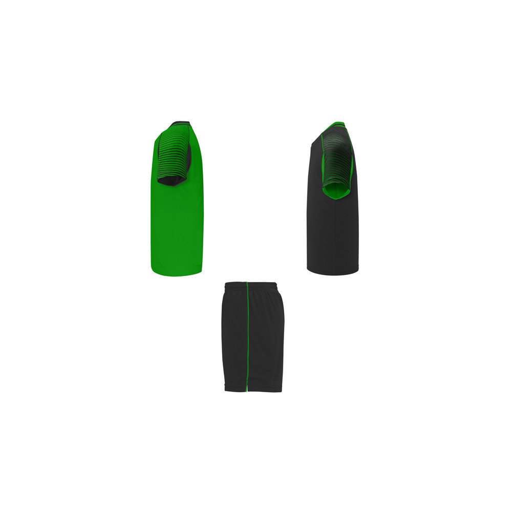 Trijų dalių sportinis rinkinys: du pusiau reglano stiliaus marškinėliai ir šortai. Marškinėliai su sublimuotomis rankovėmis ir apvaliu kaklu su trikotažu gale. Šortai su tampriu juosmeniu, vidiniu raišteliu, kontrastinga šonine apdaila ir šoniniais prakirpimais ant kraštelio.