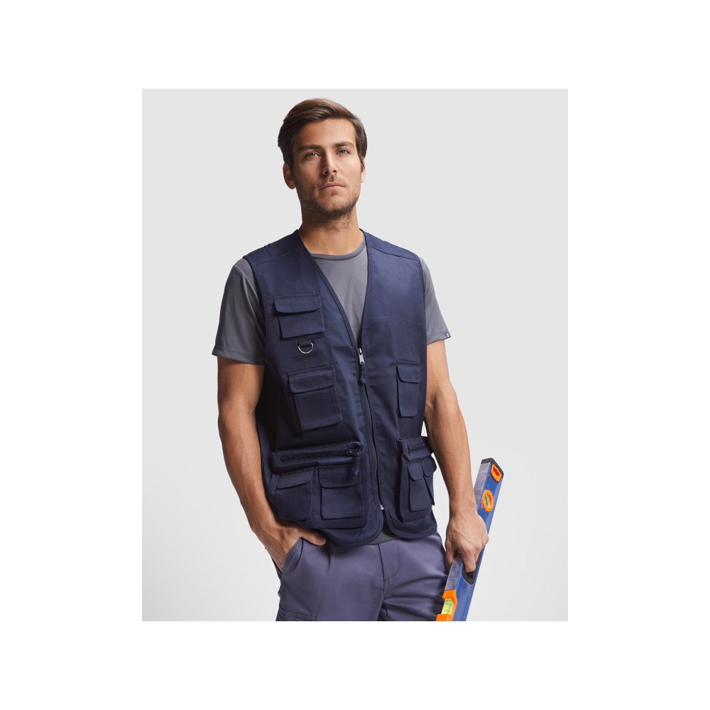 Kelių kišenių darbinė liemenė su V formos kaklu.· Priekinis užtrauktukas su traukikliu.· Trys krūtinės kišenės su užtrauktuku ir lipukais.· Viršutinė kišenė su daugiafunkciu žiedu.· Dvi šoninės kišenės su užtrauktuku ir traukikliu, su dviem persidengiančiomis kišenėmis su atvartu ir lipukais.· Dvi funkcionalios nugaros kišenės su užtrauktuku ir lipukais.· Kaklas, porankiai ir apvadas su apdaila.