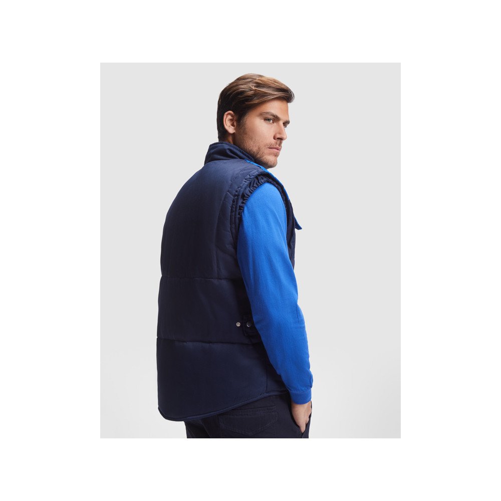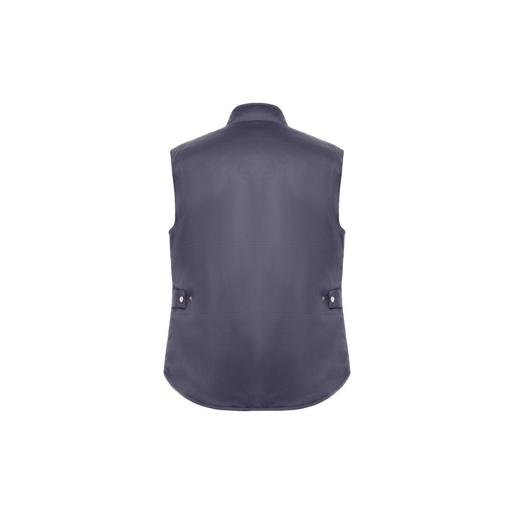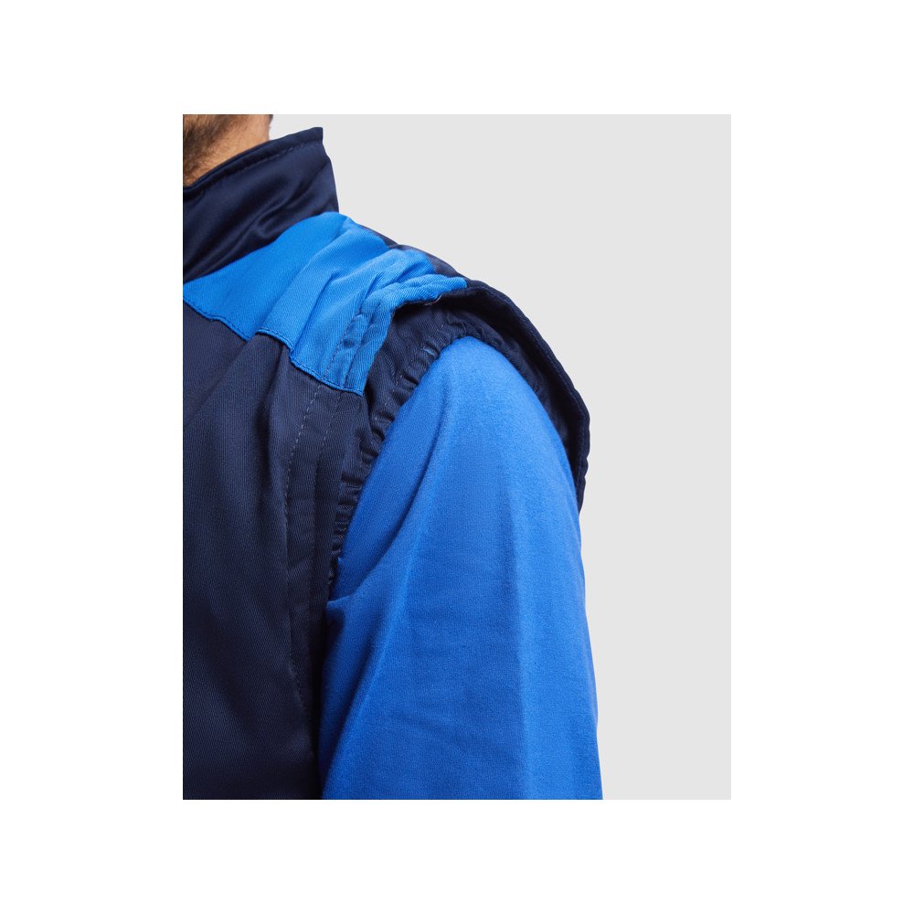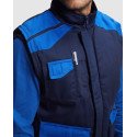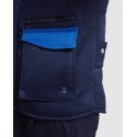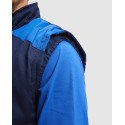 Darbo liemenė su keliomis kišenėmis, dviejų spalvų derinys, su aukšta apykakle.- Priekyje užtrauktukas su lipuku.- Vėtrungės rankogalių srityje.- Dešinioji išorinė kišenė mobiliajam telefonui su atlanku ir lipuku.- Dvi klostuotos priekinės kišenės su atvartu ir lipukais.- Dvi tušinuko kišenės.- Vidinė kišenė su lipukais.- Kišenė su užtrauktuku.- Nuleistas galas.- Automatinis reguliatorius.- Kontrastingos petnešos ir detalės.