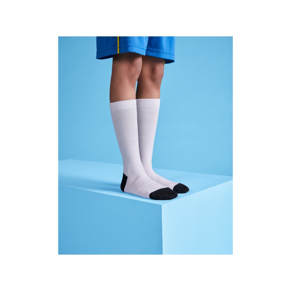 Zeķes līdz ikru vidusdaļas sublimācijai. Papēdis un kāju pirksti melnā krāsā. Kokvilnas auduma pieskāriens.