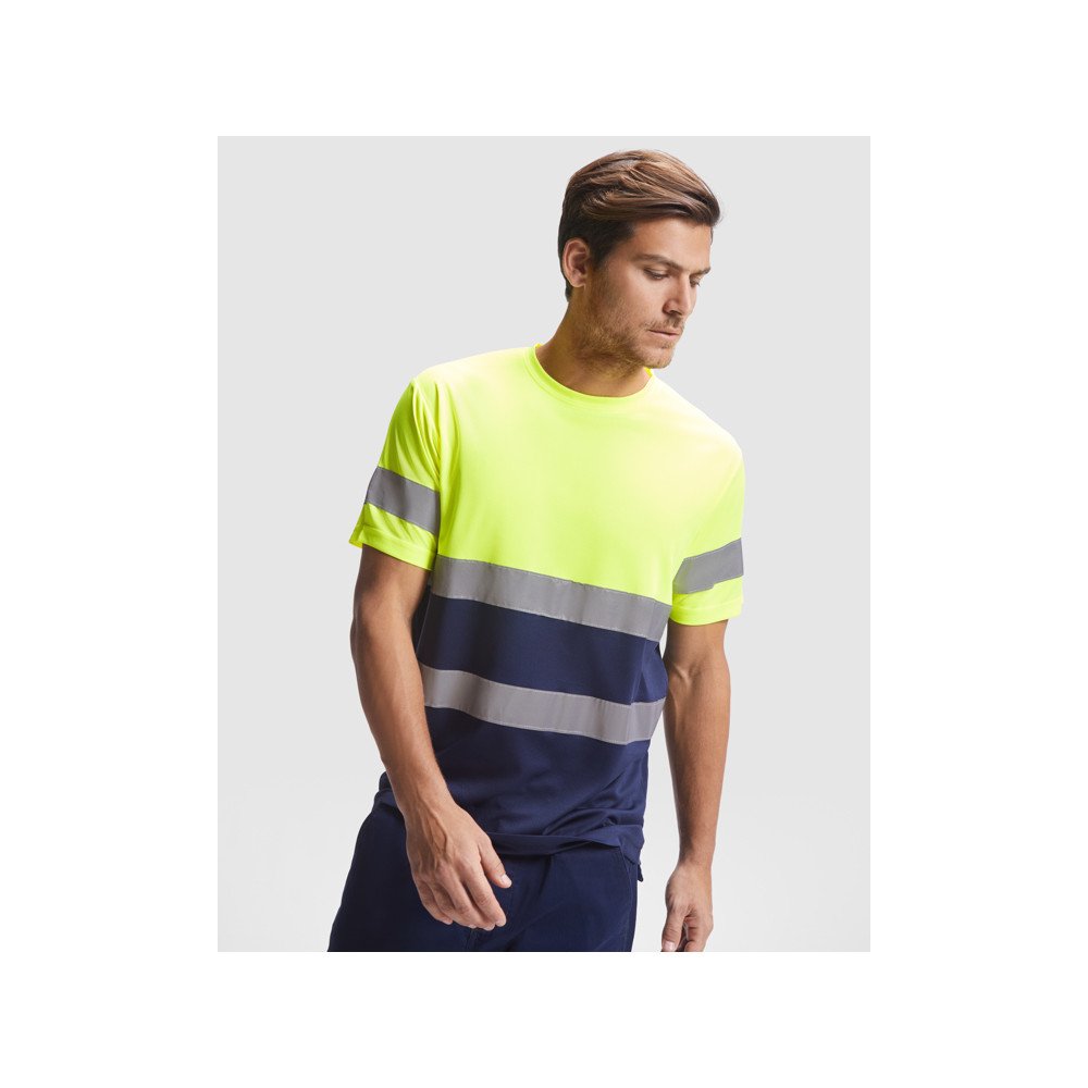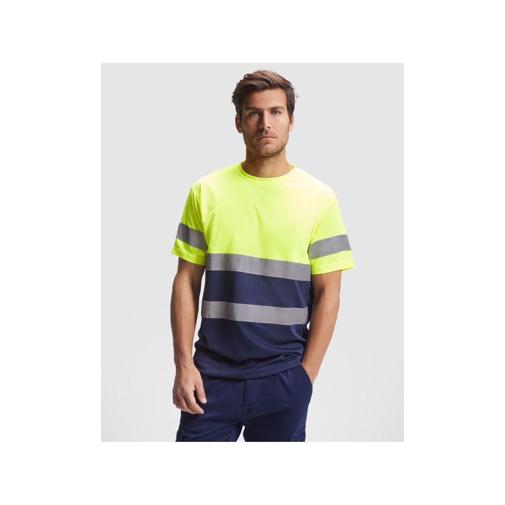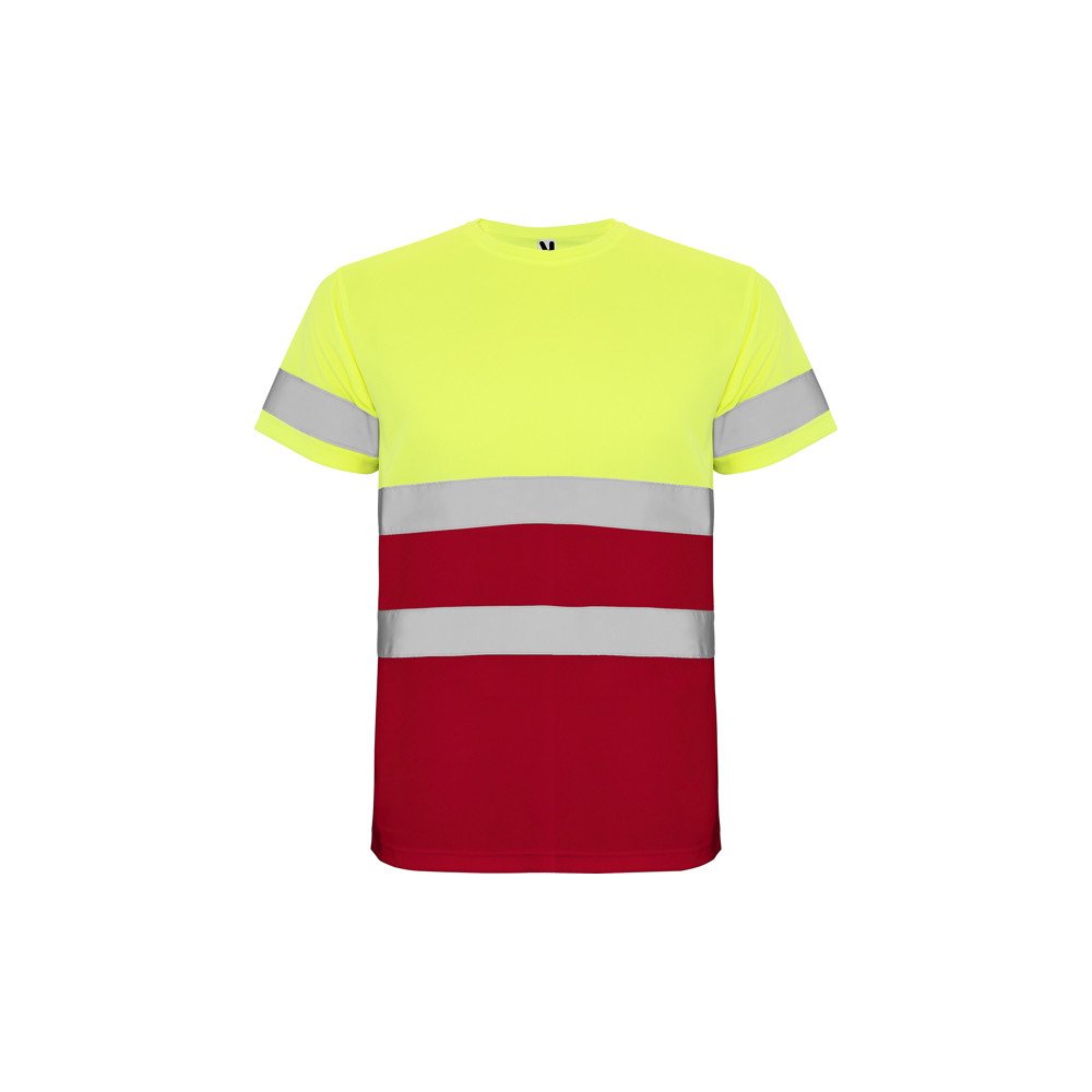 Augstas redzamības tehniskā auduma t-krekls ar īsām piedurknēm. · Apaļš kakla izgriezums ar paslēptām šuvēm. · Divas horizontālas atstarojošās līnijas vidū un viena līnija uz piedurknēm.