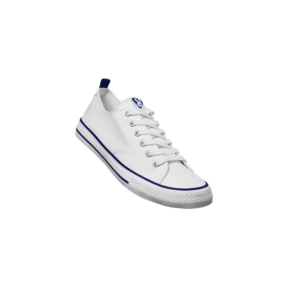 Classic canvas trainers with white rubber sole and colour stripes. Side vent eyelets, rubber toe and lace fastening.