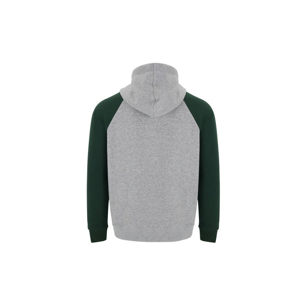 Divu krāsu unisex džemperis. Kapuce ar sakrustotu kaklu un metāla cilpām, auklas kontrastējošā krāsā. Reglāna piedurknes. Ķenguru kabata. Piedurknes apakšdaļa no elastīga, adīta, rievota auduma 1x1.