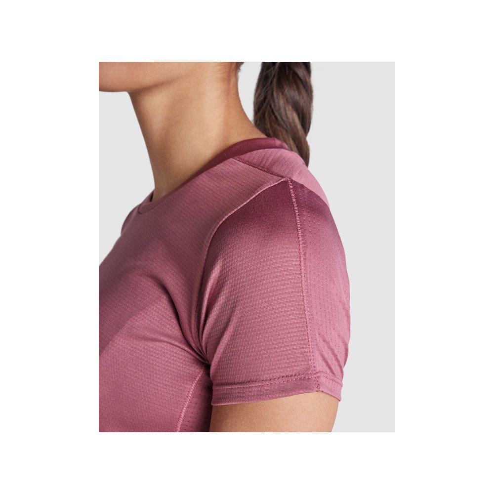 Sieviešu tehniskais t-krekls ar īsām piedurknēm. Viegls audums, kas izgatavots no pārstrādāta poliestera.· Apkakle ar sakrustotām detaļām un coverseams.· Aizmugurējā jūga un piedurknes no elpojoša auduma.· Priekšējās un slīpās šuves sānos un plecos.· Noapaļota vīle.· Apvienoti elpojošos un elastīgos audumos.