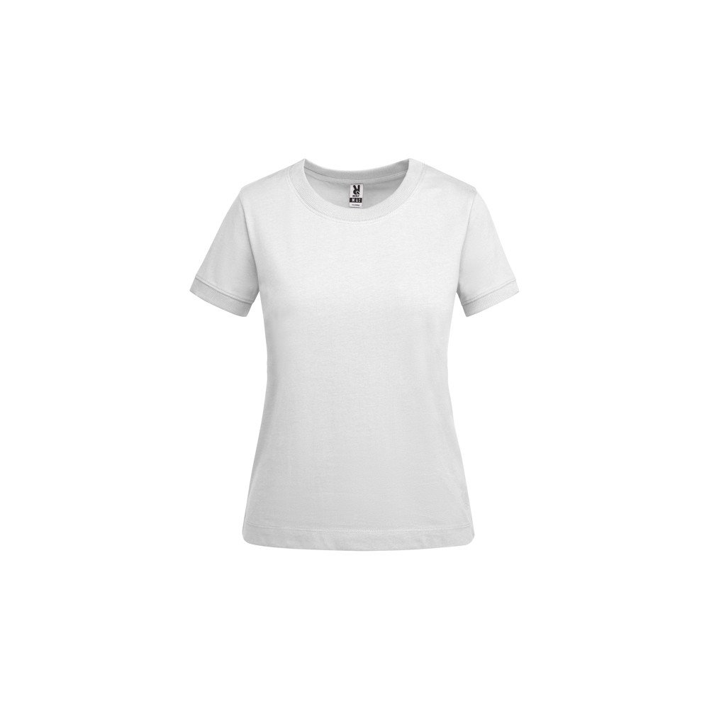 Biezs T-krekls ar īsām piedurknēm sievietēm no kokvilnas. Plata 2x1 rievota izgriezuma kakla un piedurkņu apmale. Pastiprinātas pārklātās šuves apkaklē. Sānu vīles. Atbilstošs Roly logotips kreisajā pusē uz apmales. Plata vīle uz apakšmalas.