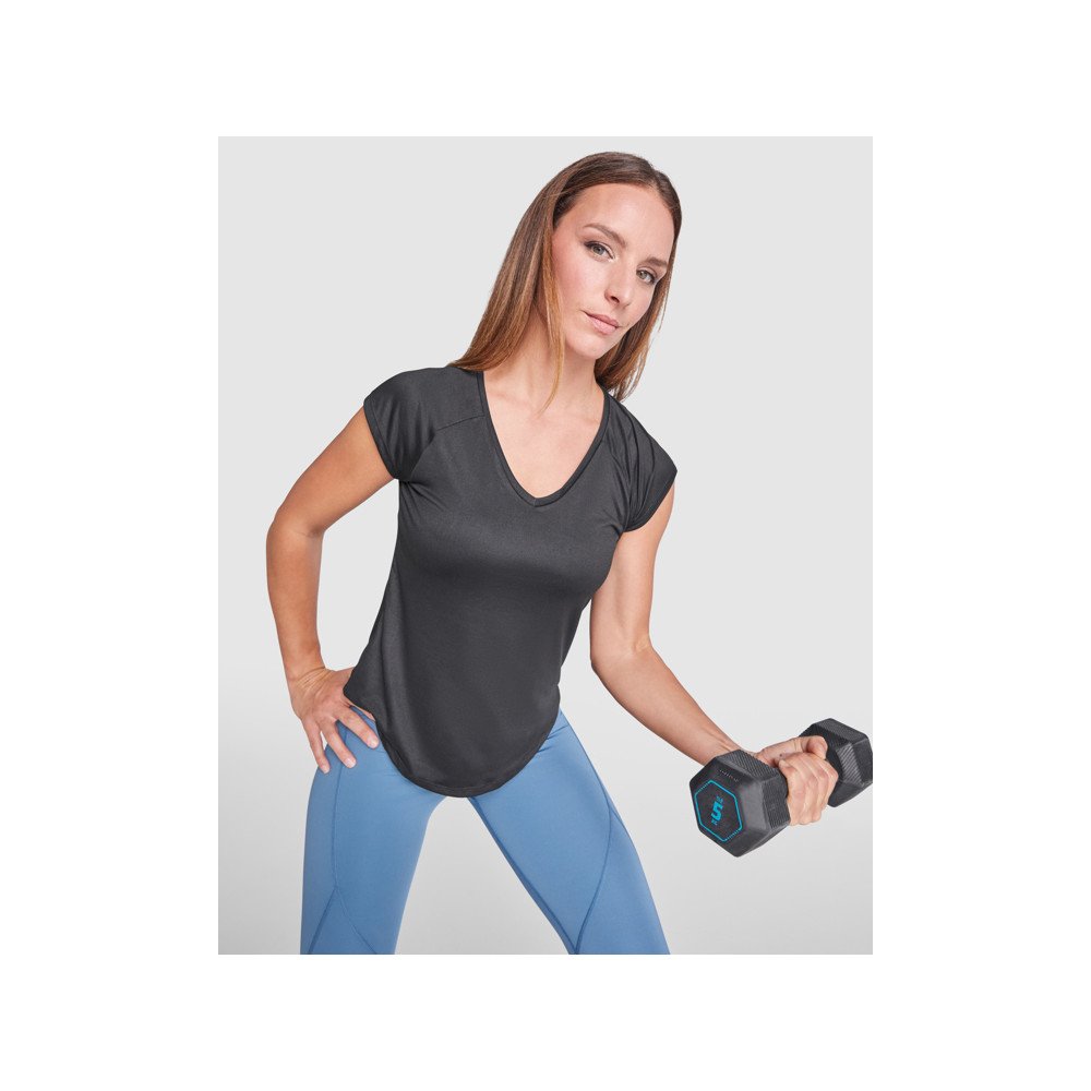 Universāls sieviešu sporta t-krekls reglāna stilā ar īsām piedurknēm. V-veida kakla izgriezums. Poliestra audums, kokvilnas pārklājums. Pieguļoša forma.