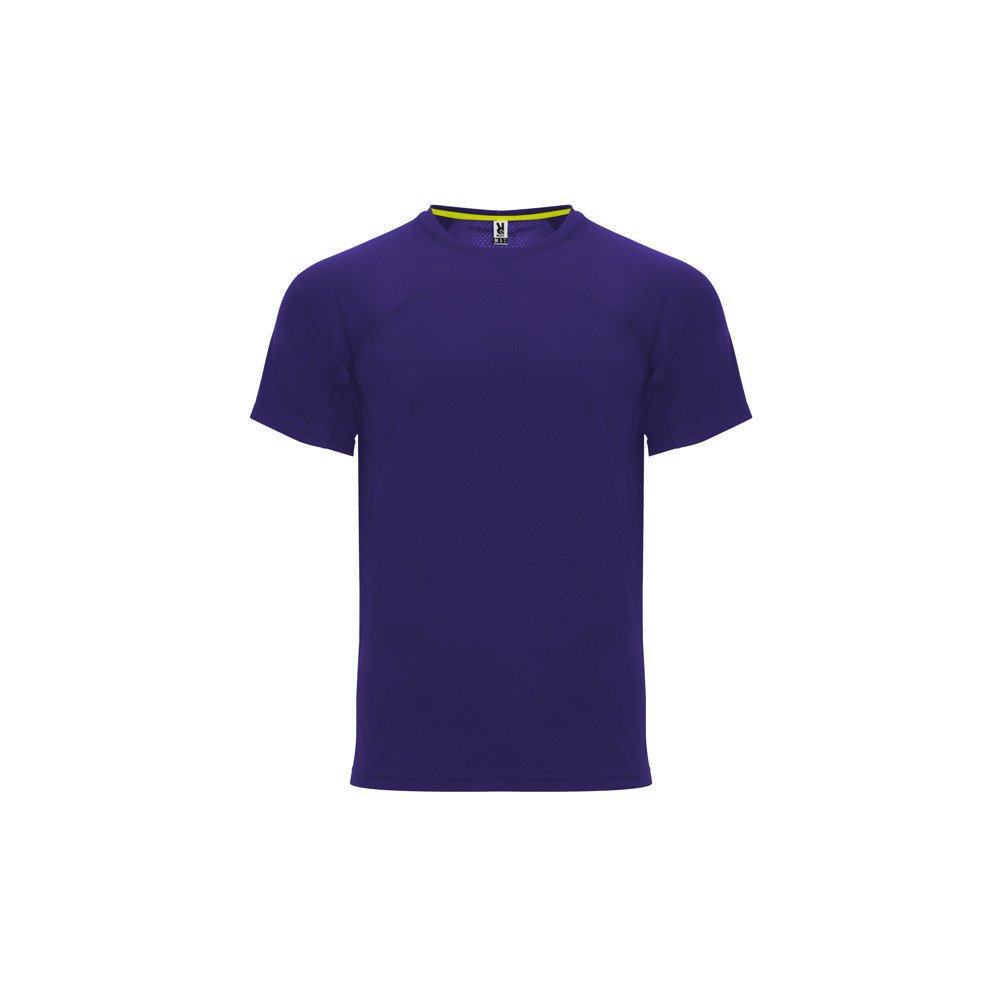 Unisex tehniskais t-krekls ar īsām piedurknēm.1. Taisna kakla līnija ar pastiprinātām pārklātām vīlēm spilgti dzeltenā krāsā kontrastam.2. Divu poliestera audumu kombinācija uz muguras.