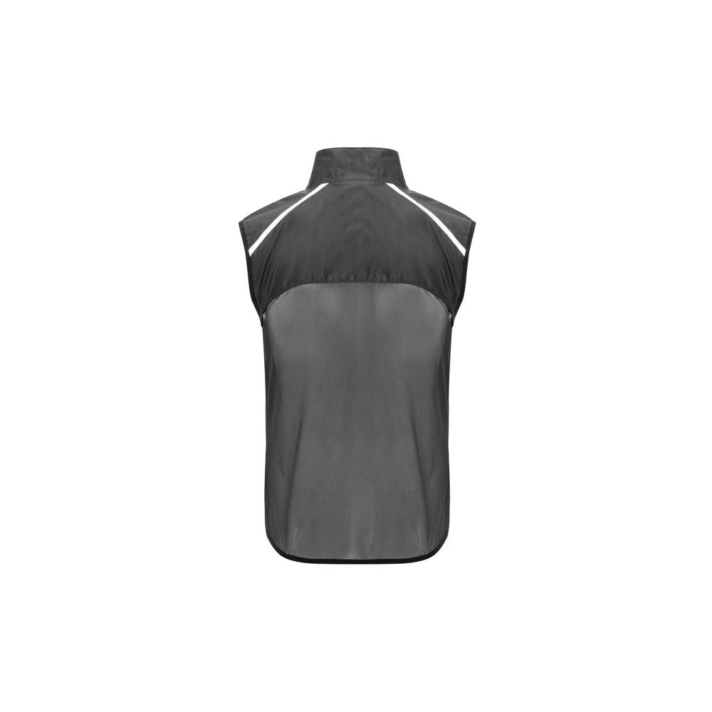 Viegla tehniska veste skriešanai.1. Priekšpusē pieskaņots rāvējslēdzējs ar zoda aizsargu.2. Elastīga apakšējās daļas un piedurkņu apdare.3. Aizmugures apakšējā daļa no mikroperforēta auduma.4. Atstarojošās detaļas augšā, priekšā un aizmugurē.5. Maisiņš, kurā ielikt vesti un ko var uzvilkt uz rokas.