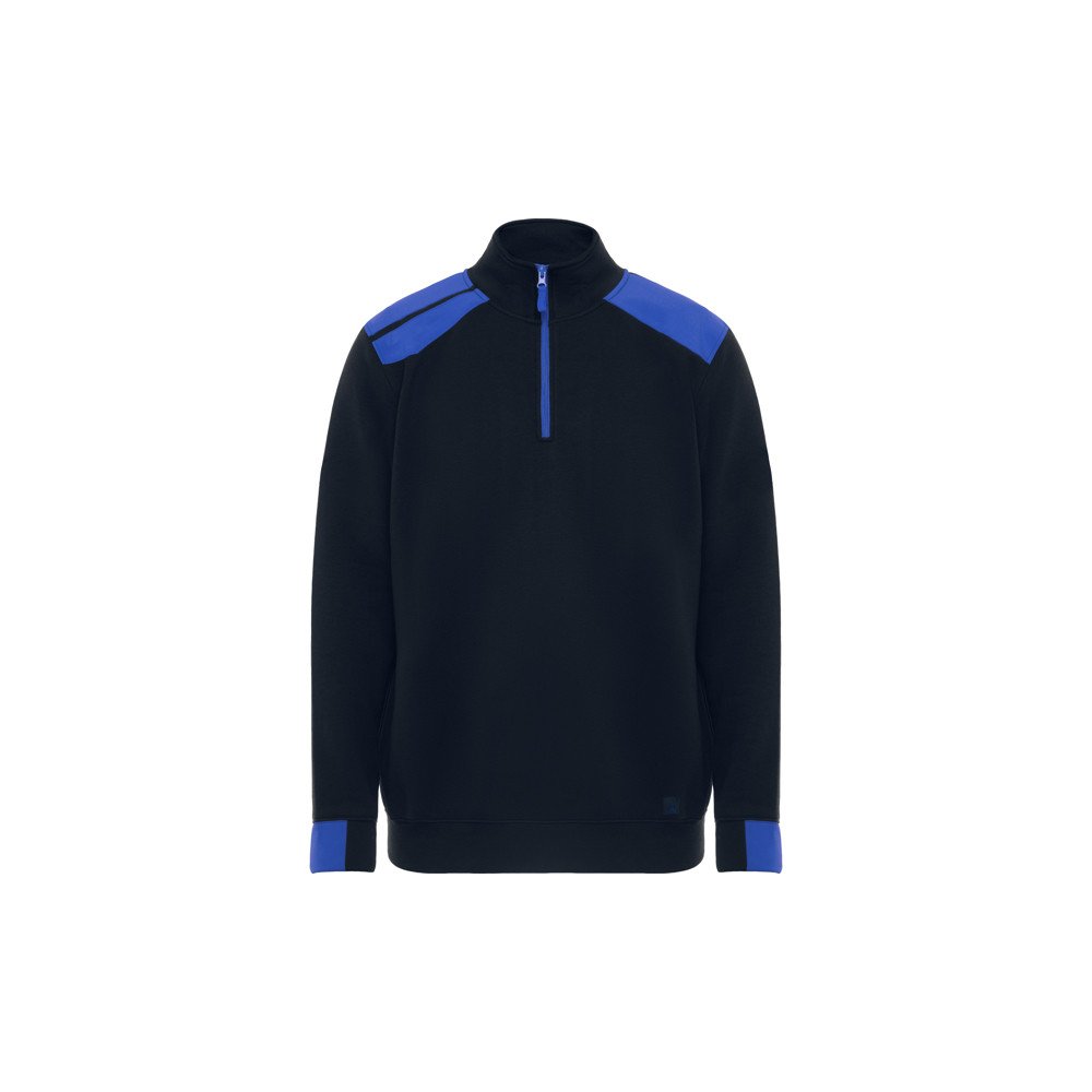 Džemperis kombinētās krāsās ar pusrāvējslēdzēju un augstu apkakli. · Rievota adījuma 1x1 pusaproces un apakšmala. · Pastiprināts vīļu pārklājums apkakles iekšpusē. · Plecu daļas un kontrastējošas detaļas.