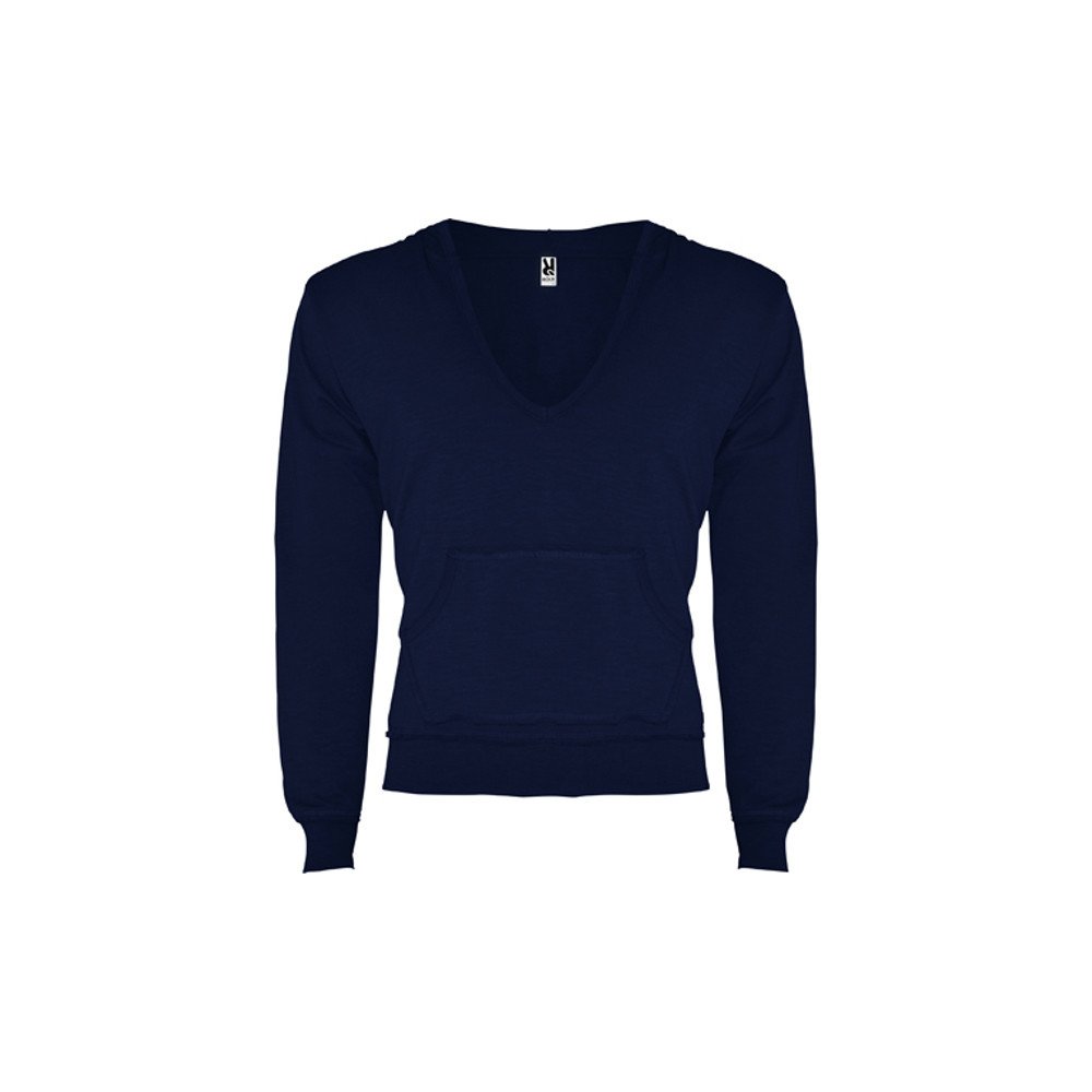 Sporta krekls ar kapuci un izteiktu V-veida kakla izgriezumu, rievas no tā paša auduma. Ķengura stila kabata. 1x1 rieva ar nepabeigtu apdari aprocēs un apakšmalā.