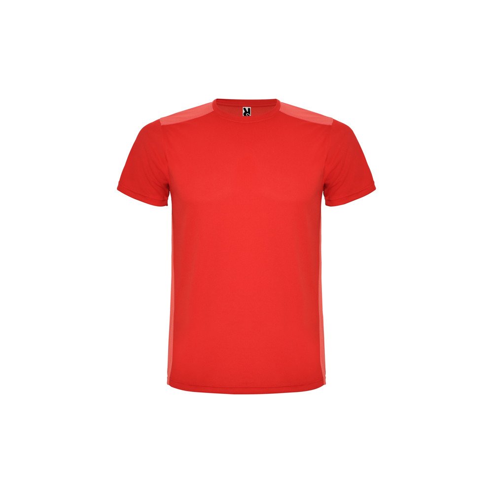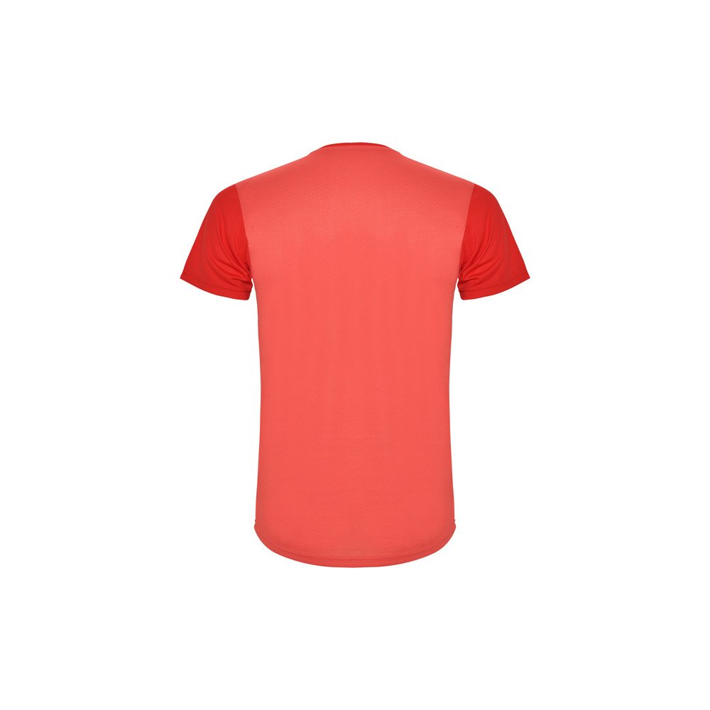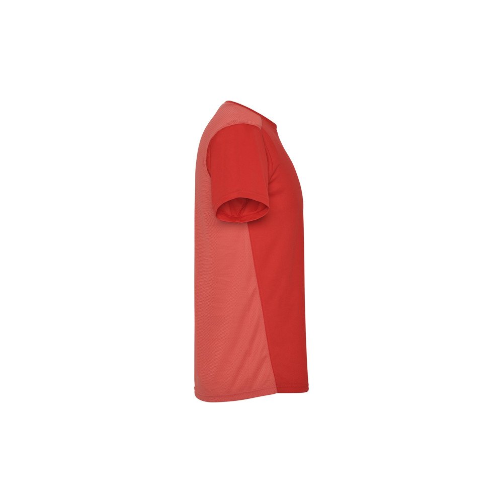Īsu piedurkņu tehniskais t-krekls.1.- Apaļš kakla izgriezums.2.- Divi poliestra audumi ir kombinēti aizmugurē un plecos.3.- Šūnveida audums priekšā un elpojoša sietiņa aizmugurē.4.- Audums apstrādāts tā lai uzsūk mitrumu.5.- Dekoratīva zig zag šuve uz pleciem un sāniem.6.- Mugura ir nedaudz garāka.