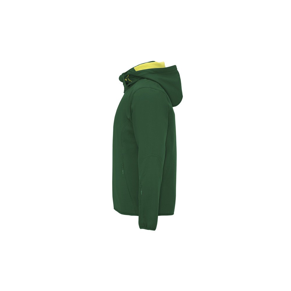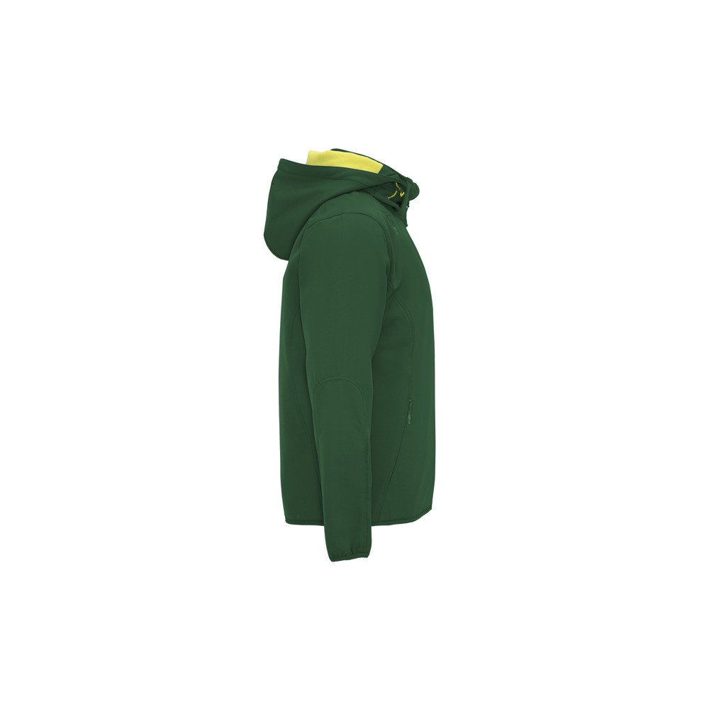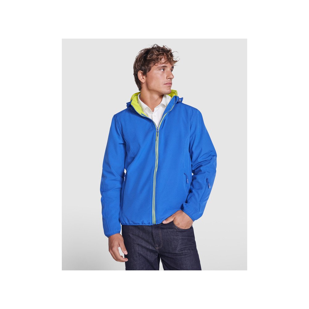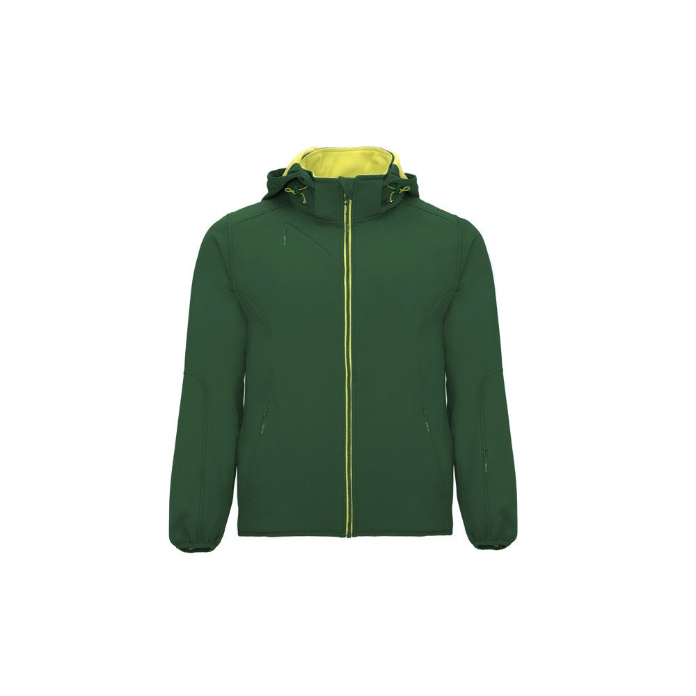Necaurlaidīga jaka Softshell, kas sastāv no 2 kārtām, sportisks modelis: Kontrastējošas krāsas centrālie rāvējslēdzēji ar zoda aizsargu un vilcēju. Kontrastējošas krāsas iekšējā odere no microfleece auduma. Ārējā kabata uz krūtīm, kreisajā pusē ar neredzamu rāvējslēdzēju, diagonāla forma. Sānos divas ārējās kabatas ar neredzamu rāvējslēdzēju. Kabata uz kreisās piedurknes. Noņemamais kapucis