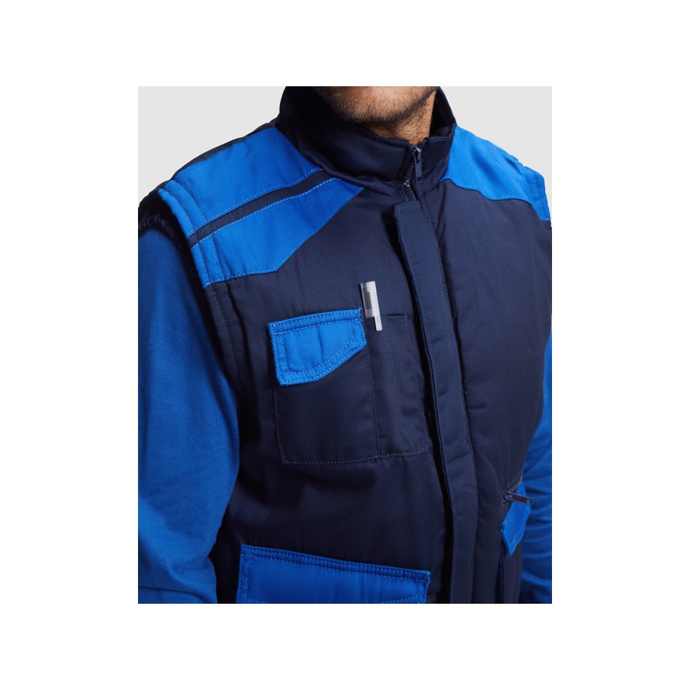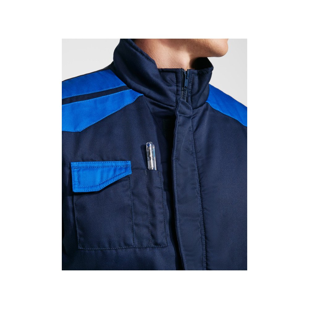 Darba veste ar vairākām kabatām un augstu apkakli kombinētās krāsās.· Vidū rāvējslēdzēja un velcro aizdare. · Vējjaka ar aprocēm.· Ārējā kabata mobilajām ierīcēm labajā pusē ar pārloku un velcro.· Divas priekškabatas ar ieloci, pārloku un velcro.· Divas kabatiņas pildspalvām.· Iekšējā kabata ar velcro.· Kabata ar rāvējslēdzēju. · · Mugurpusē svārku stila apakšdaļa.· Regulators ar automātisku aizdari.· Kontrastējošas plecu daļas un detaļas.