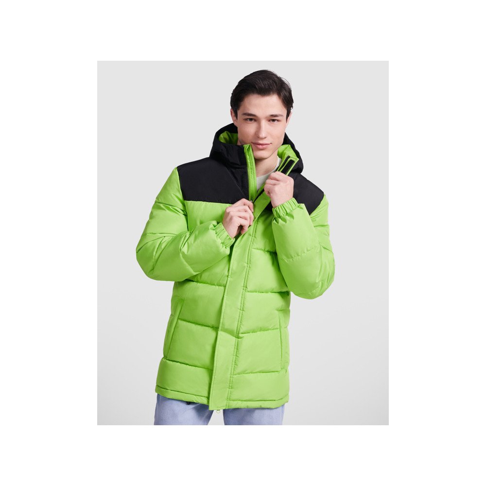 Polsterēta jaka ar fiksētu kapuci.Priekšējais rāvējslēdzējs pārklāts ar placketu.Zoda aizsargs. Divas sānu kabatas ar rāvējslēdzēju.Elastīgās aproces Lekšējā piekļuve atkārtotai apstrādei mugurpusē un kreisajā krūškurvī.