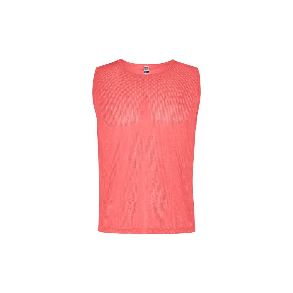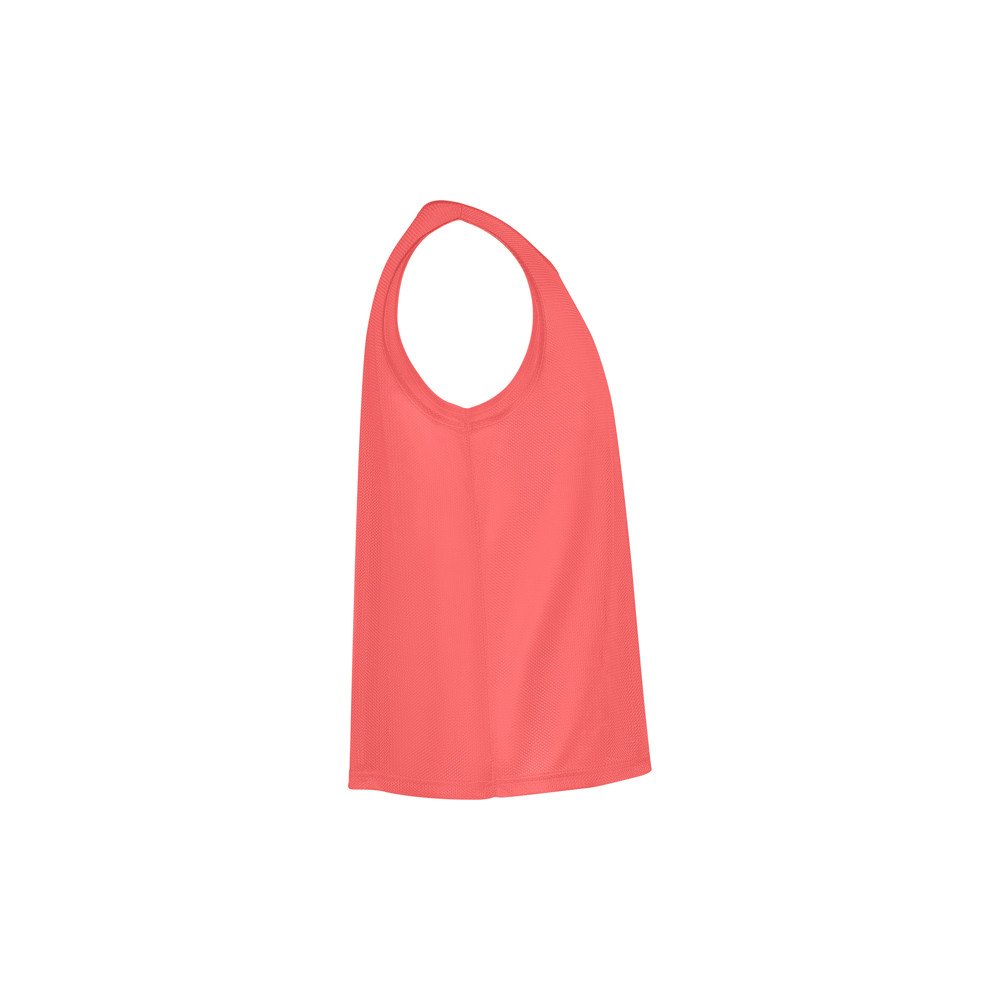 Дышащий спортивный жилет, унисекс. Швейная отделка из той же ткани в отверстиях для рукавов и горловине. Двойная прошивка снизу.