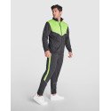 Спортивный костюм из легкой и эластичной ткани. Куртка с контрастными цветами и швейной отделкой на груди. Высокий воротник с контрастными швами. Центральная застежка-молния. Боковые карманы. Манжеты и талия в рубчик 2x2. Брюки с эластичным поясом и кулиской. Контрастная боковая часть с швейной отделкой. Молния снизу.