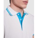 Футболка поло с короткими рукавами и планкой на три пуговицы в тон. Внутренняя планка, контрастная по отношению к внешней. Воротник и манжеты в рубчик, усиленные закрытые швы горловины. Боковые разрезы.