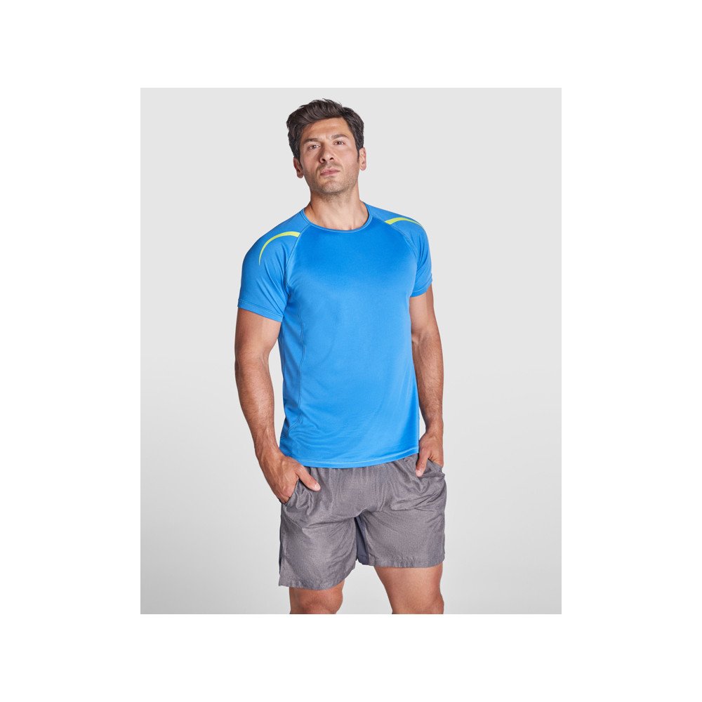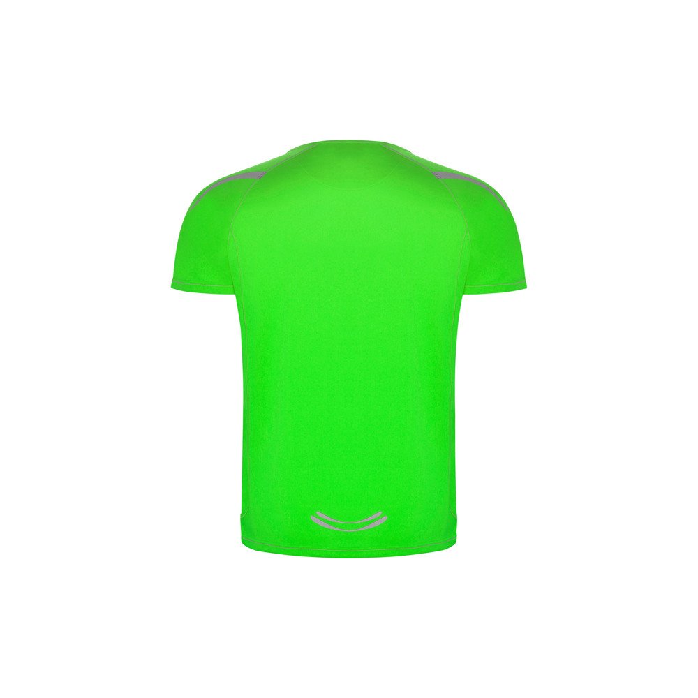 Техническая футболка с рукавами реглан с дышащей ткани. Быстросохнущая ткань. Контрастные швы на манжетах рукавов, внизу, горловине и боках. Горловина с окантовкой из той же ткани. Светоотражающие детали, за исключением моделей черного и ярко-синего цветов, контрастирующих с желтым цветом, который не является светоотражающим.