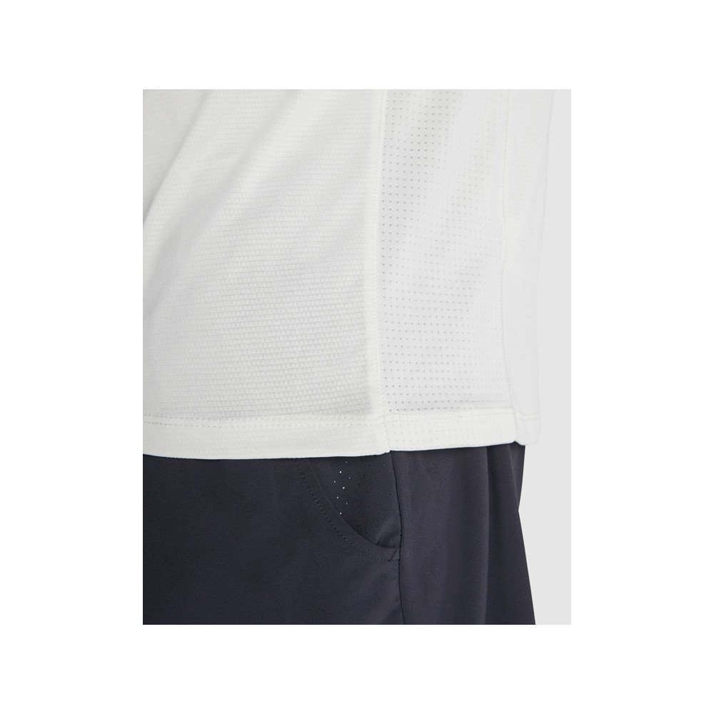 Мужская специальная футболка с коротким рукавом. Легкая ткань из переработанного полиэстера. Воротник с перекрещенными деталями и закрывающими швами. Зона спины и рукава из дышащей ткани. Передние и наклонные швы по бокам и плечам. Сочетание дышащих и эластичных тканей.