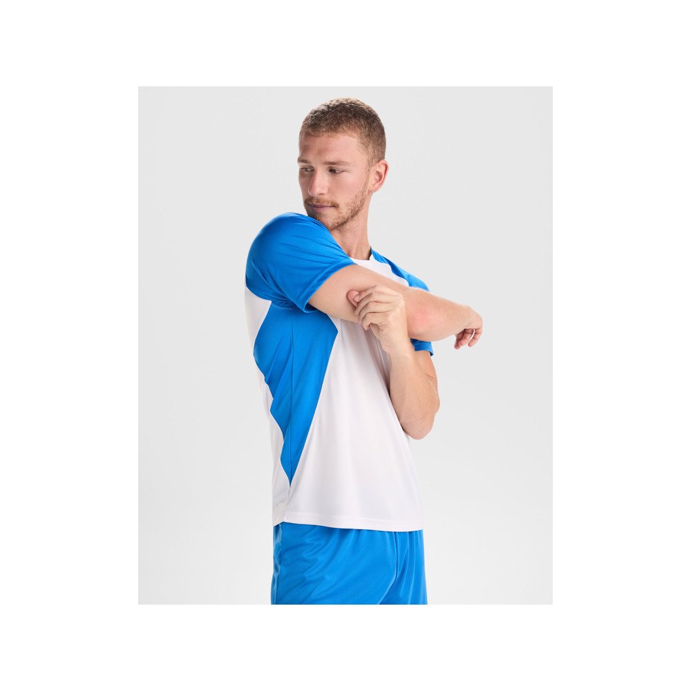 Техническая футболка с короткими рукавами реглан. 1. Круглая горловина с закрытыми швами в тон. 2. Контрастные рукава и боковые вставки.