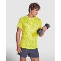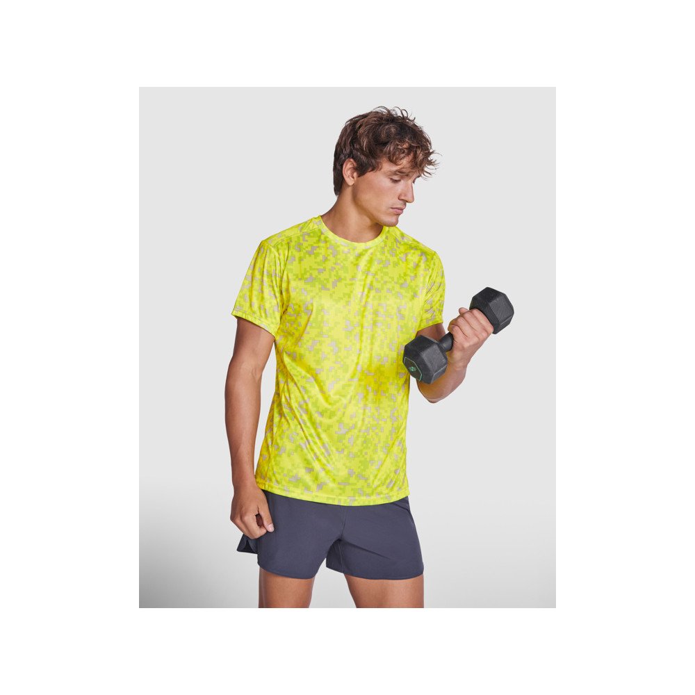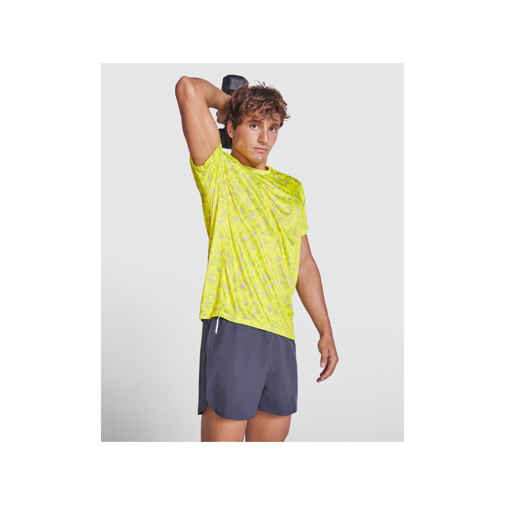 Техническая футболка с принтом и короткими рукавами. Круглая горловина с усиленными закрытыми швами контрастного неоново-желтого цвета. Боковые вставки с внутренней стороны рукавов и на плечах с оверлочными швами в тон.