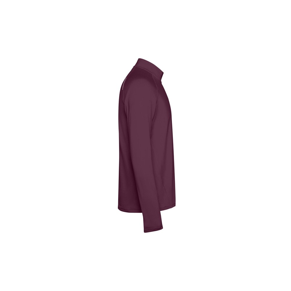 Техническая толстовка реглан с длинными рукавами. Воротник с обернутой застежкой-молнией и светоотражающей деталью. Усиленные покрывающие швы. Манжеты с отверстиями для большого пальца. Светоотражающие детали сзади. Задний край немного длиннее переднего. Внутренняя теплая ткань с начесом.