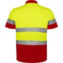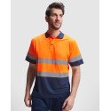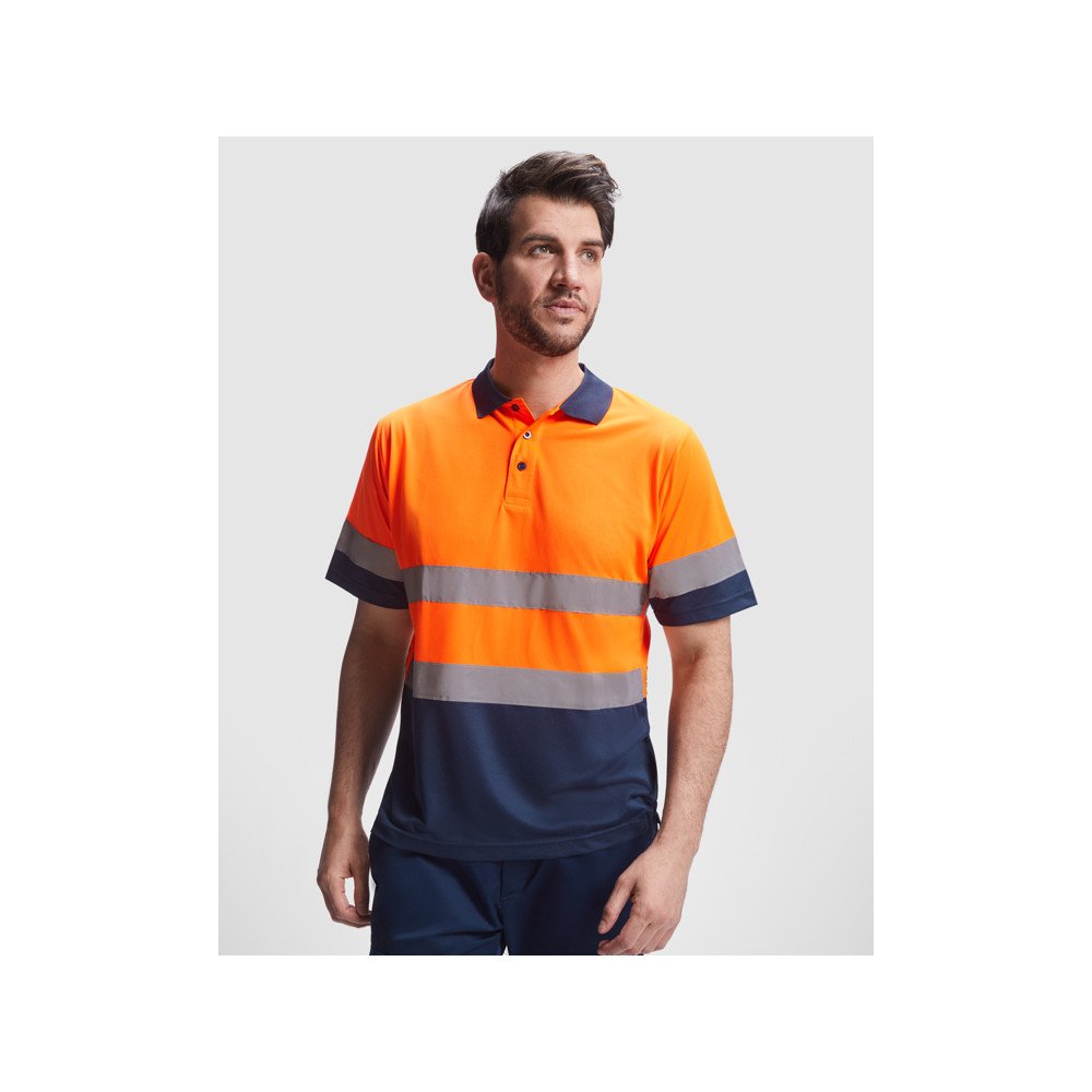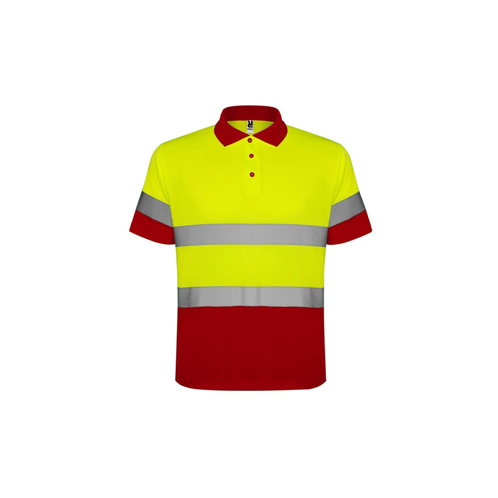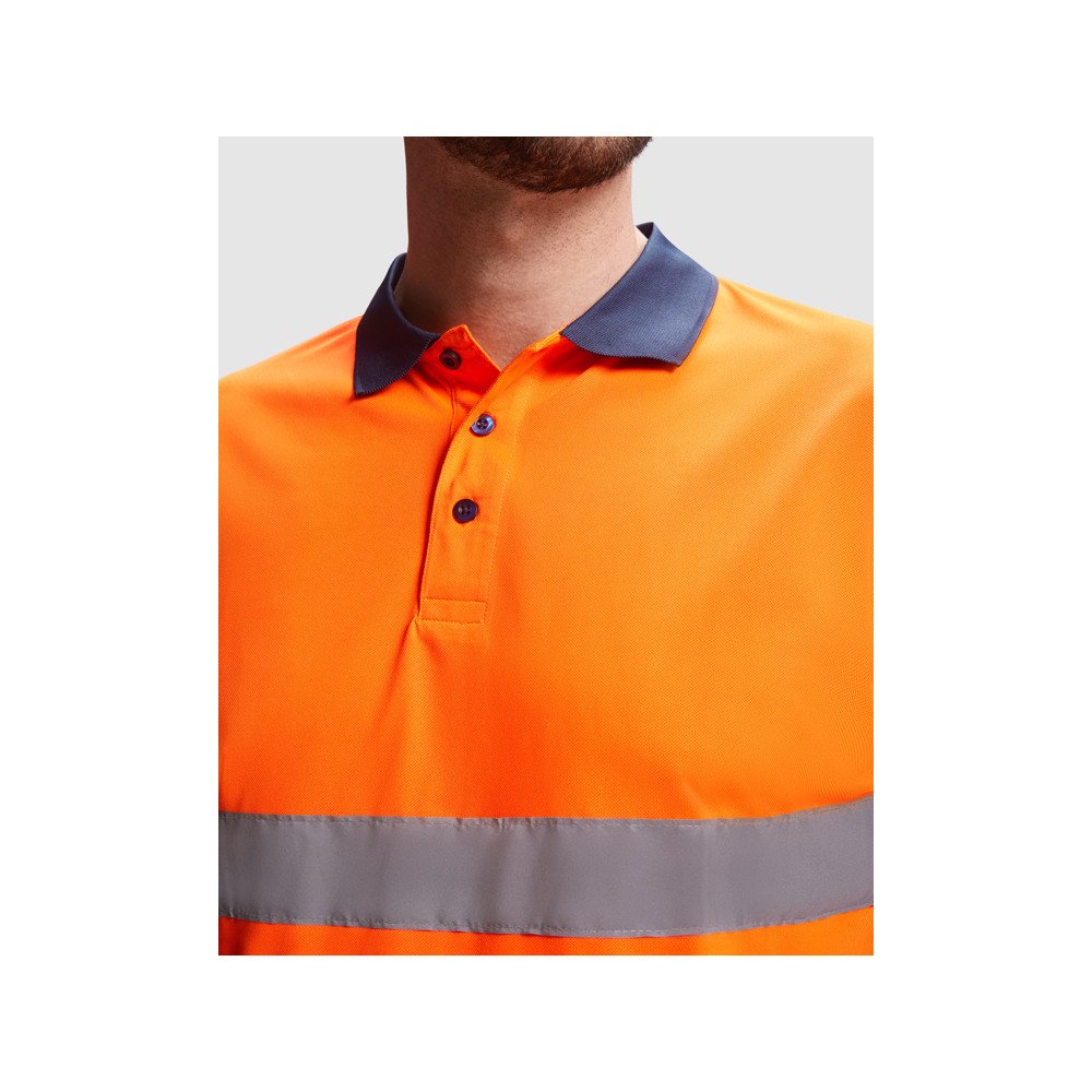 Техническая футболка поло с короткими рукавами повышенной видимости. Планка на 3 пуговицы. Горловина в рубчик 1 x 1. Две горизонтальные светоотражающие полосы на туловище и рукавах. Ткань предотвращает зацепление.
