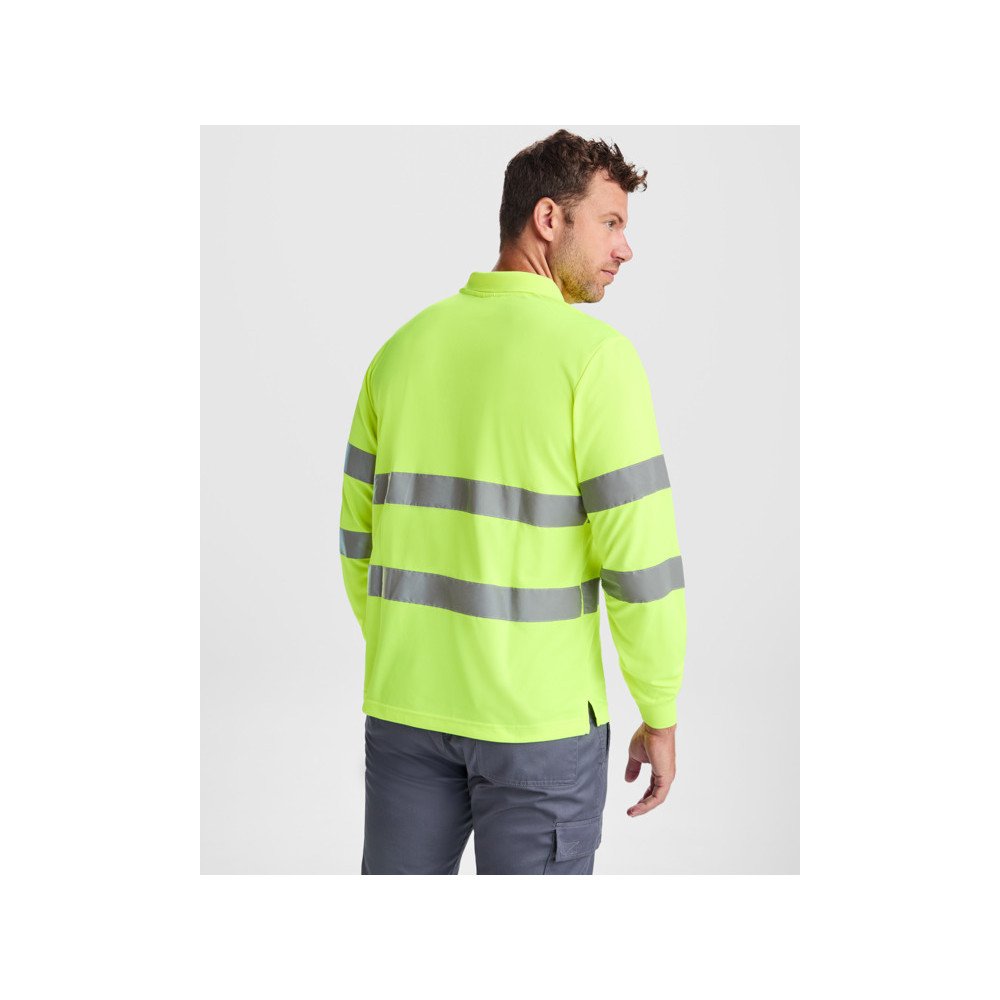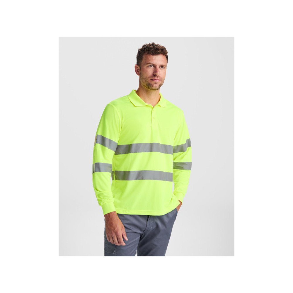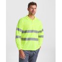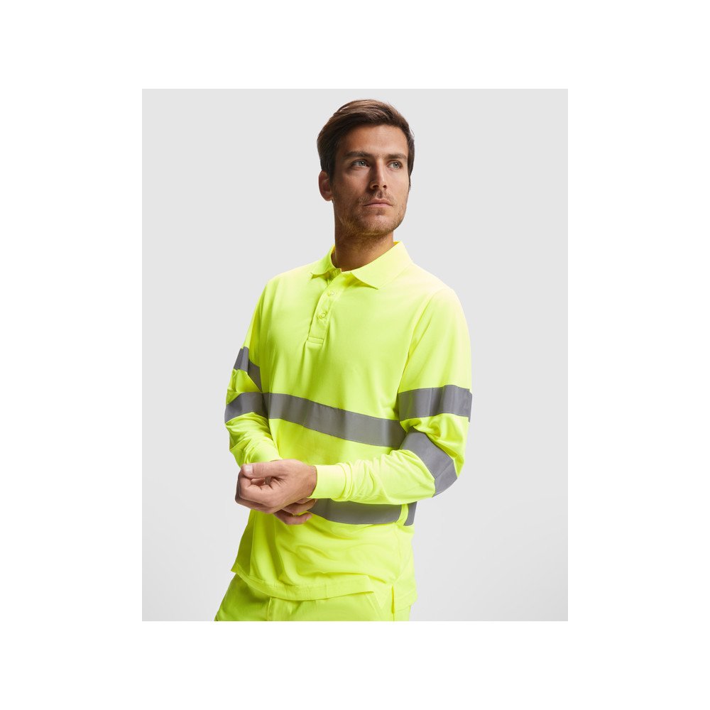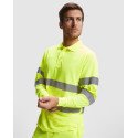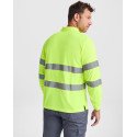 Техническая футболка поло повышенной видимости с длинными рукавами. Планка на 3 пуговицы. Воротник и манжеты в рубчик 1 x 1. Две горизонтальные светоотражающие полосы на туловище и рукавах. Ткань предотвращает зацепление.