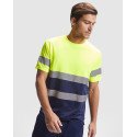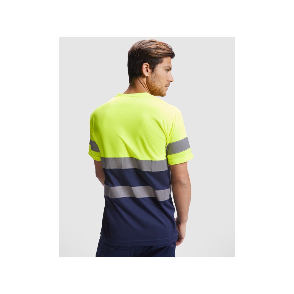 Техническая футболка повышенной видимости с короткими рукавами. Круглая горловина из той же ткани, с усиленными закрытыми швами на внутренней стороне горловины. Две горизонтальные светоотражающие полосы на туловище и одна светоотражающая полоса на рукавах.
