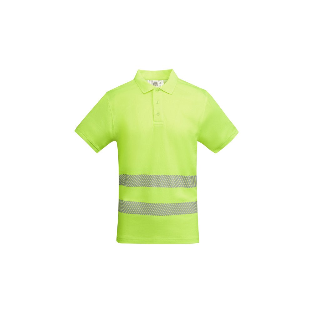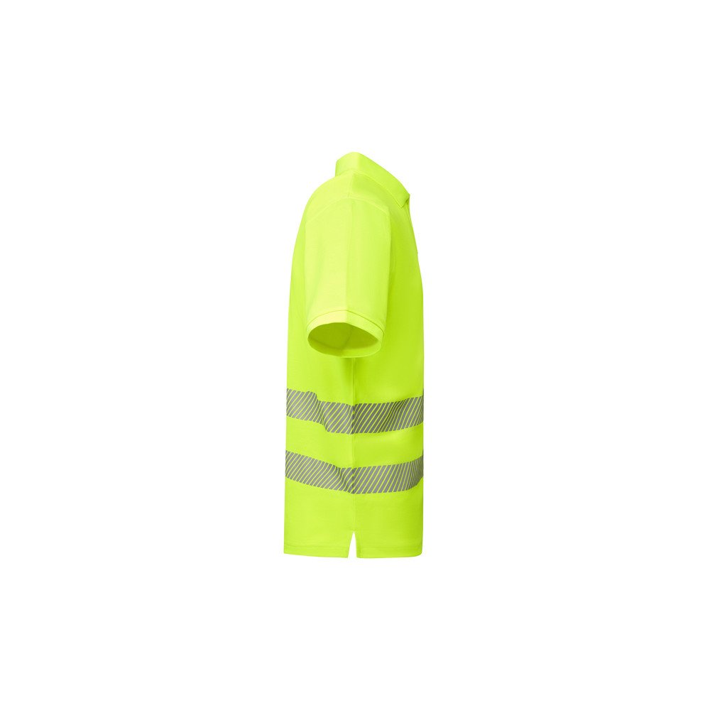 Техническая мужская хорошо видимая рубашка·поло с коротким рукавом с воротником в рубчик 1x1. Контрастный разрез с застежкой на 3 пуговицы. Две светоотражающие сегментированные полосы на груди. Микс полиэстера и хлопка для повышенной воздухопроницаемости. Дополнительный карман.