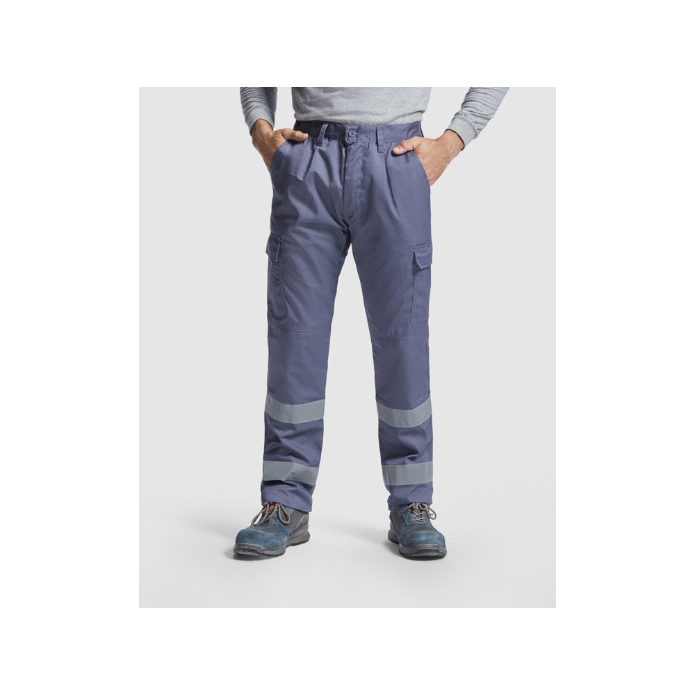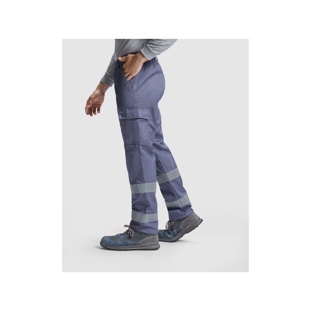 Брюки повышенной видимости из прочной ткани. 1. Регулируемый эластичный пояс сзади.2. Два кармана спереди.3. Функциональный карман сзади с клапаном на липучке. 4. Два боковых карманы с клапаном на липучке. 5. Дополнительное усиление сзади для защиты от протирания при сидении. 6. Двойная ткань на коленях. 7. Две горизонтальные светоотражающие полосы.