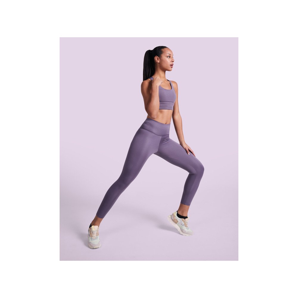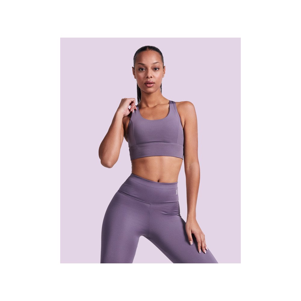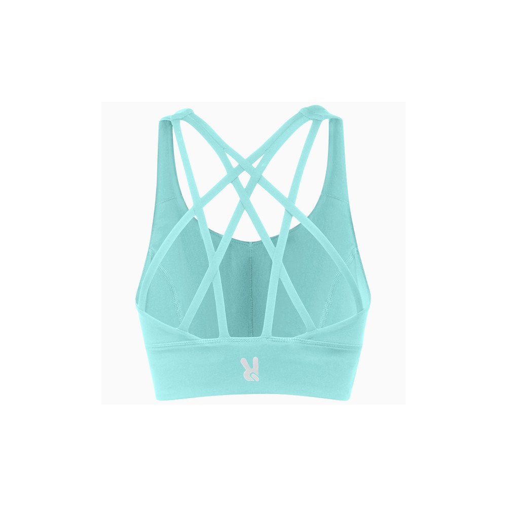 Спортивный женский топ с высокой поддержкой. Спинка·борцовка. Усиленная эластичная резинка под бюстом. Двойная ткань и подкладка. Съемные чашечки из пеноматериала. Светоотражающий логотип Roly на спине.
