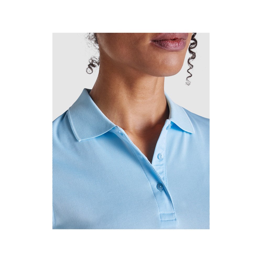 Женская техническая футболка поло с короткими рукавами. Трикотажный воротник с планкой на три пуговицы. Приталенный крой.