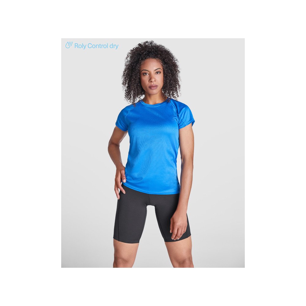 Женская техническая футболка с короткими рукавами реглан. 1. Круглая горловина с закрытыми швами в тон. 2. Вставки внизу на рукавах. 3. Оверлочные швы в тон на проймах и вставке на рукаве. 4. Ткань с технологией CONTROL DRY.