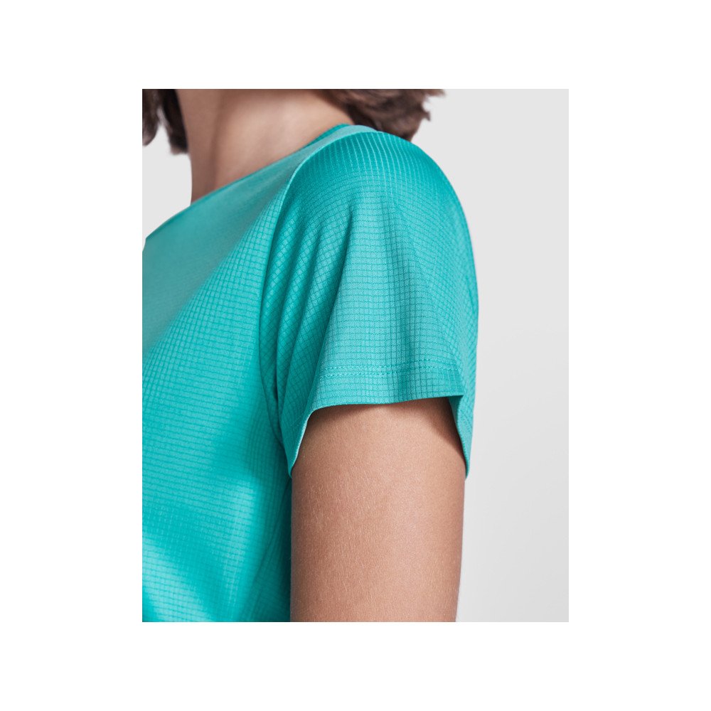 Приталенная женская техническая футболка с коротким рукавом. Отделка горловины в цвет. Задний край немного длиннее переднего. Боковые швы смещены вперед.