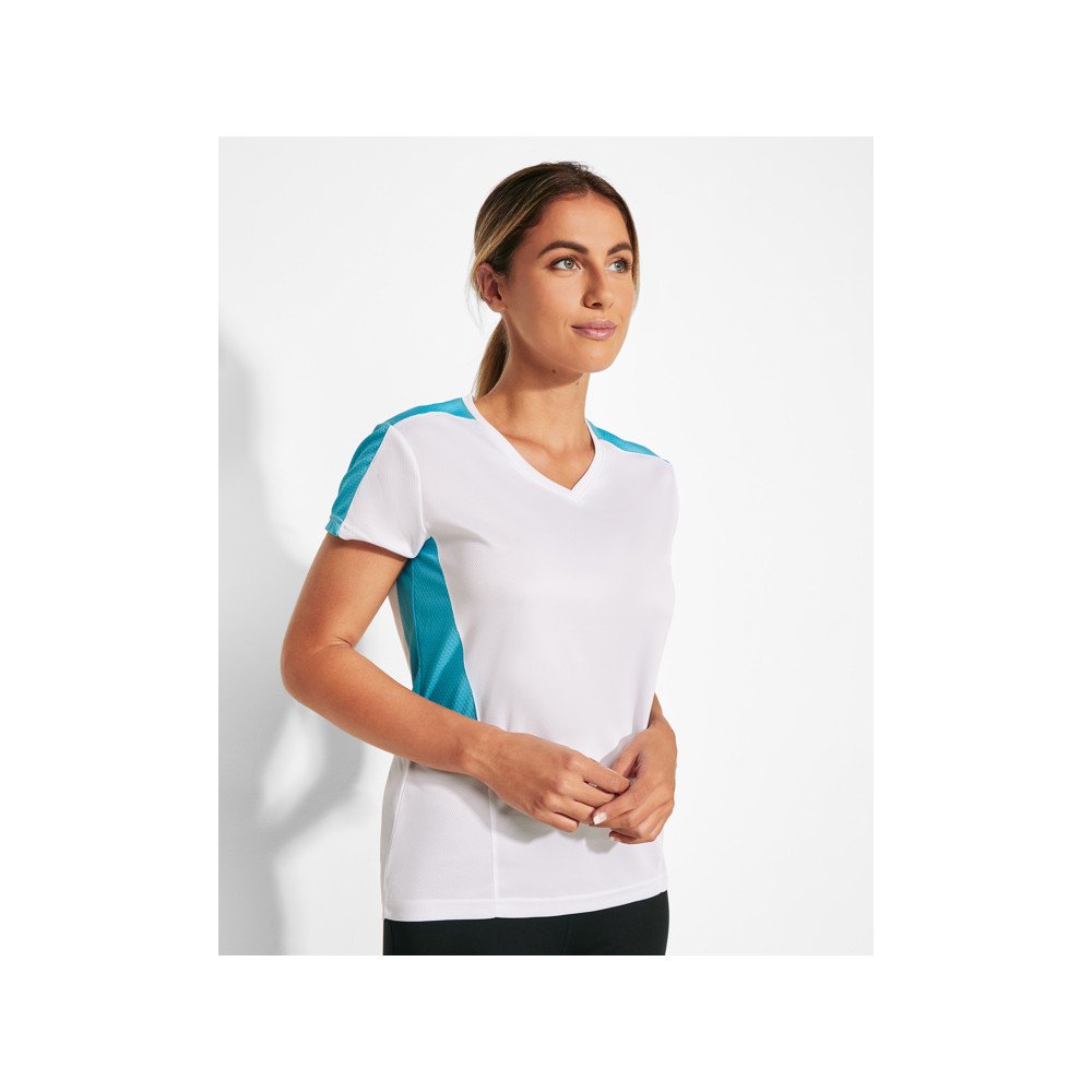 Женская техническая футболка с короткими рукавами.1. Горловина с V-образным вырезом.2. Сочетание двух тканей с полиэстера на плечах и боках. 3. Основная ткань — ткань bird's eye, и 3D-сетчатая дышащая ткань — на плечах и боковых вставках. 4. Ткань, подготовлена для впитывания влаги.