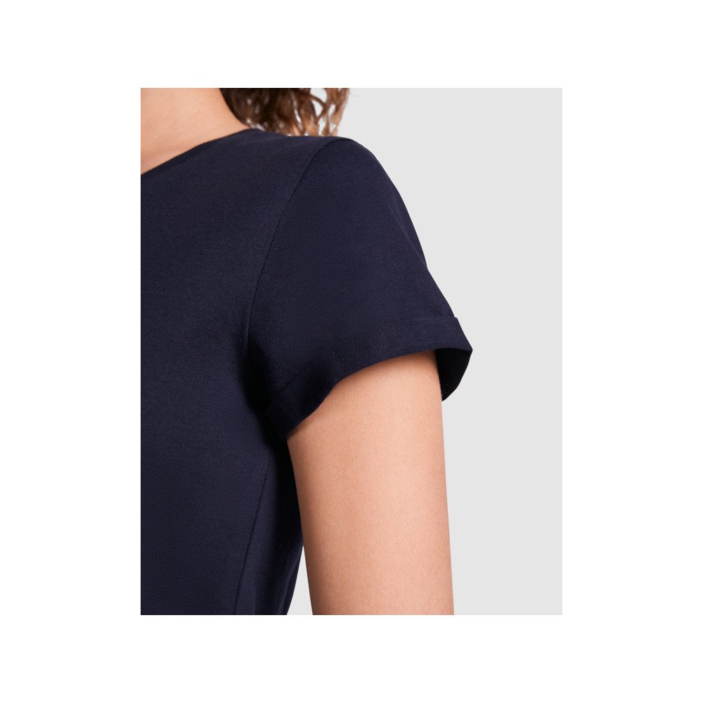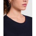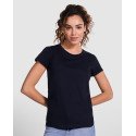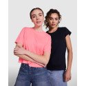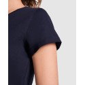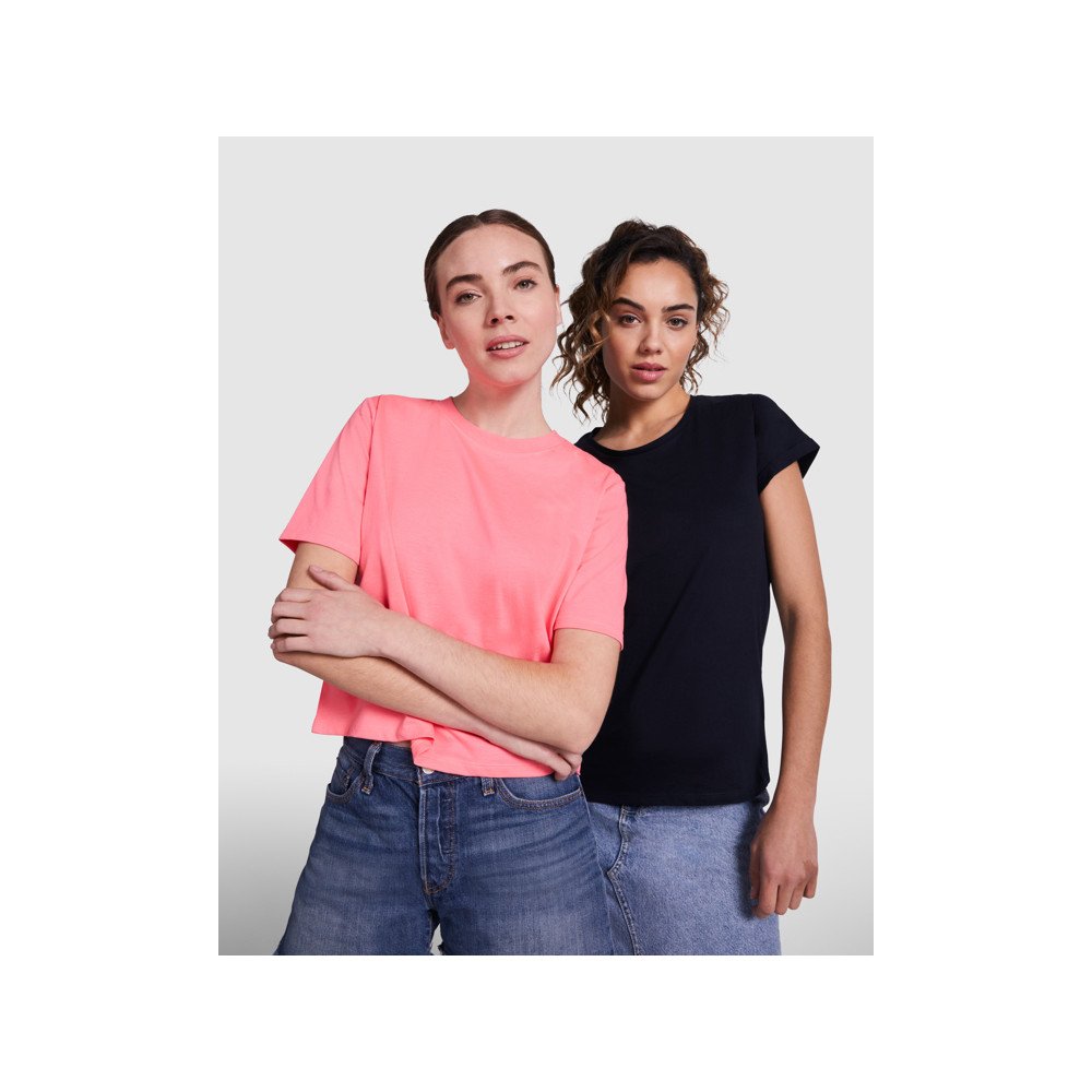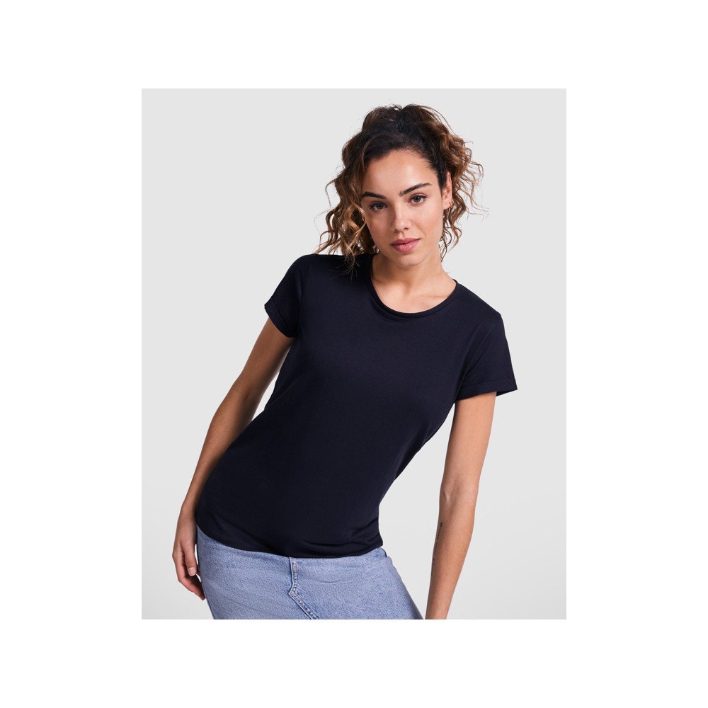 Женская футболка с короткими рукавами. Круглая горловина с той же ткани и внутренние швы в тон. Рукава с отворотом, закрепленным в четырех точках.