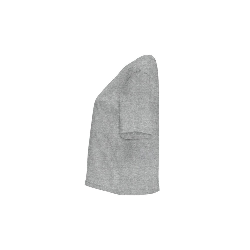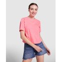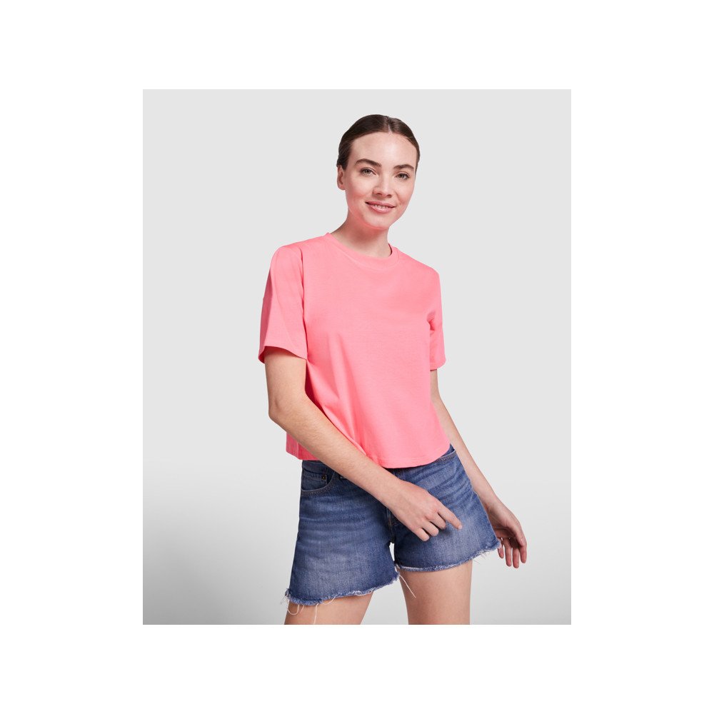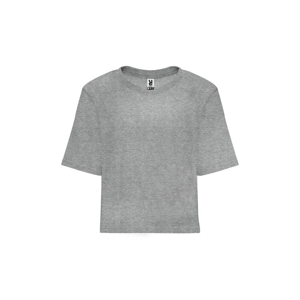 Женская короткая футболка свободного кроя с короткими рукавами. Круглая горловина с широкой окантовкой в рубчик 1 x 1. Усиленные закрытые швы в тон.