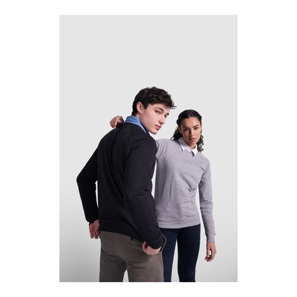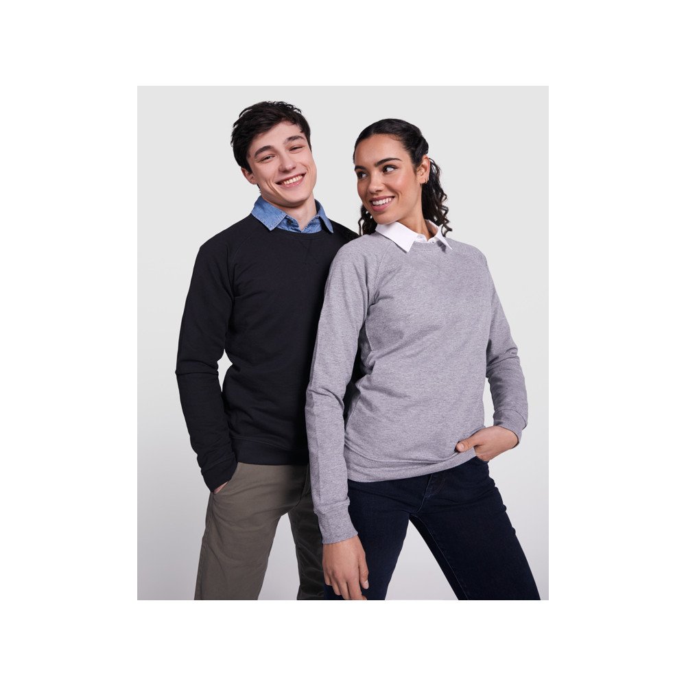 Хлопковый свитшот с длинными рукавами реглан. Горловина, манжеты и низ из ткани в рубчик 2 x 1. Круглая горловина с усиленными закрытыми внутренними швами. Перекрещенные оверлочные швы спереди из ткани в рубчик 2 x 1.