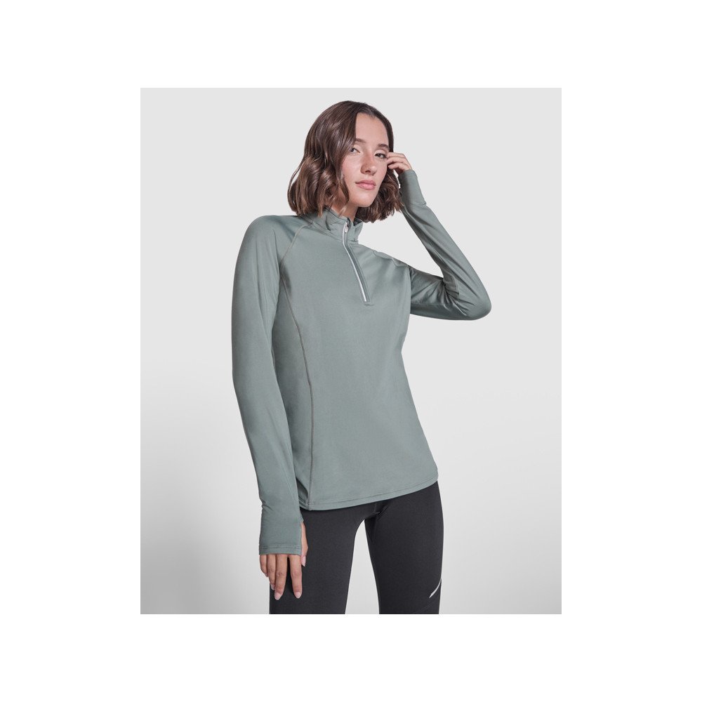Женская техническая приталенная толстовка с длинным рукавом реглан. Воротник с обернутой застежкой-молнией и светоотражающей лентой. Усиленные покрытия швов. Манжеты с отверстиями для большого пальца. Светоотражающие детали сзади. Задний край немного длиннее переднего. Внутренняя теплая ткань с начесом.