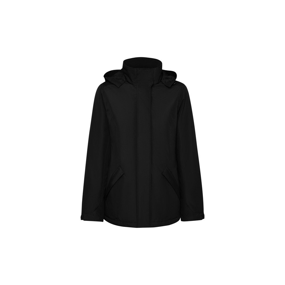 Женская водонепроницаемая приталенная куртка-парка с мягкой подкладкой. Высокий воротник со складным капюшоном и застежкой-липучкой. Центральная застежка-молния с клапанами. Боковые карманы на застежке-молнии с фиксированным клапаном. Внутренний карман с застежкой-липучкой. Регулируемые манжеты с петлей для ремня на липучке. Внутренний доступ для персонализации и декорирования на левой стороне груди и спине.